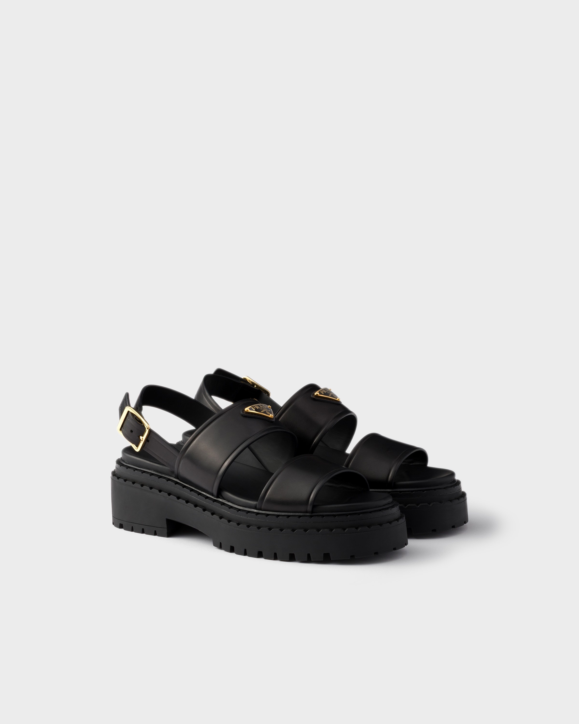 Sporty style and artisan refinement are combined in the design of these leather sandals. The footwear is defined by chunky soles that give it a versatile and distinctive character and is decorated with the iconic triangle logo. - Product code: 1X104O_7V6_F0002_F_055 - Upper with heel strap and metal buckle - Enameled metal triangle logo - Rubber monoblock sole, 55 mm, with lug tread and hot-stamped logo - Notched-effect double welt - Imported MATERIALS Main material: Calfskin