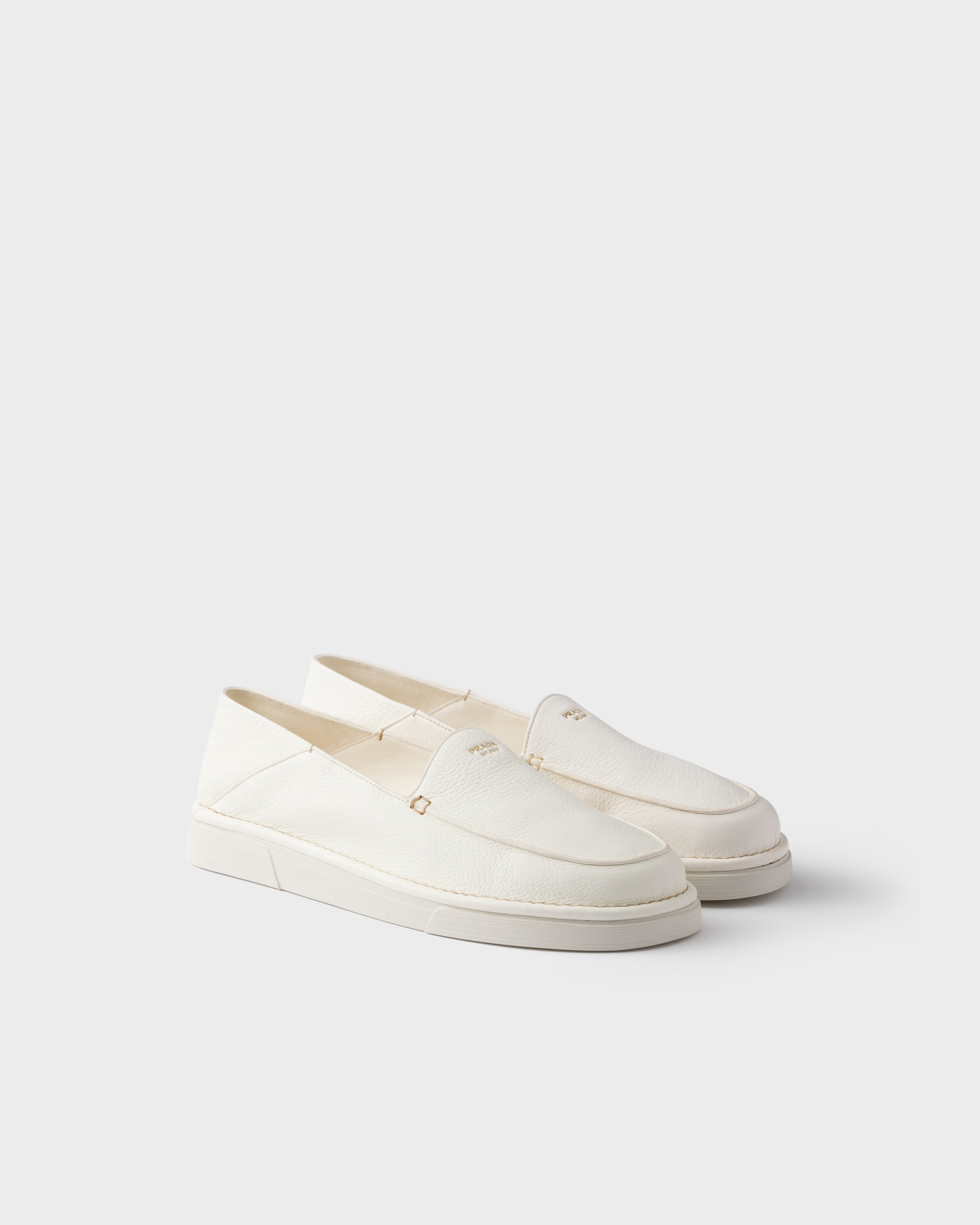 These leather slip-ons have a sleek, tapered silhouette with a casual attitude. The versatile, lightweight footwear features soles in a contrasting color, while the Prada Milano logo completes the shoe with a distinctive, refined touch. - Product code: 2DF088_013_F0304_F_G000 - Upper with stitched apron - Prada Milano logo on the upper - Lightweight expanded rubber sole with triangle-patterned tread, 25 mm - Leather-covered insole - Imported MATERIALS Main material: Buckskin