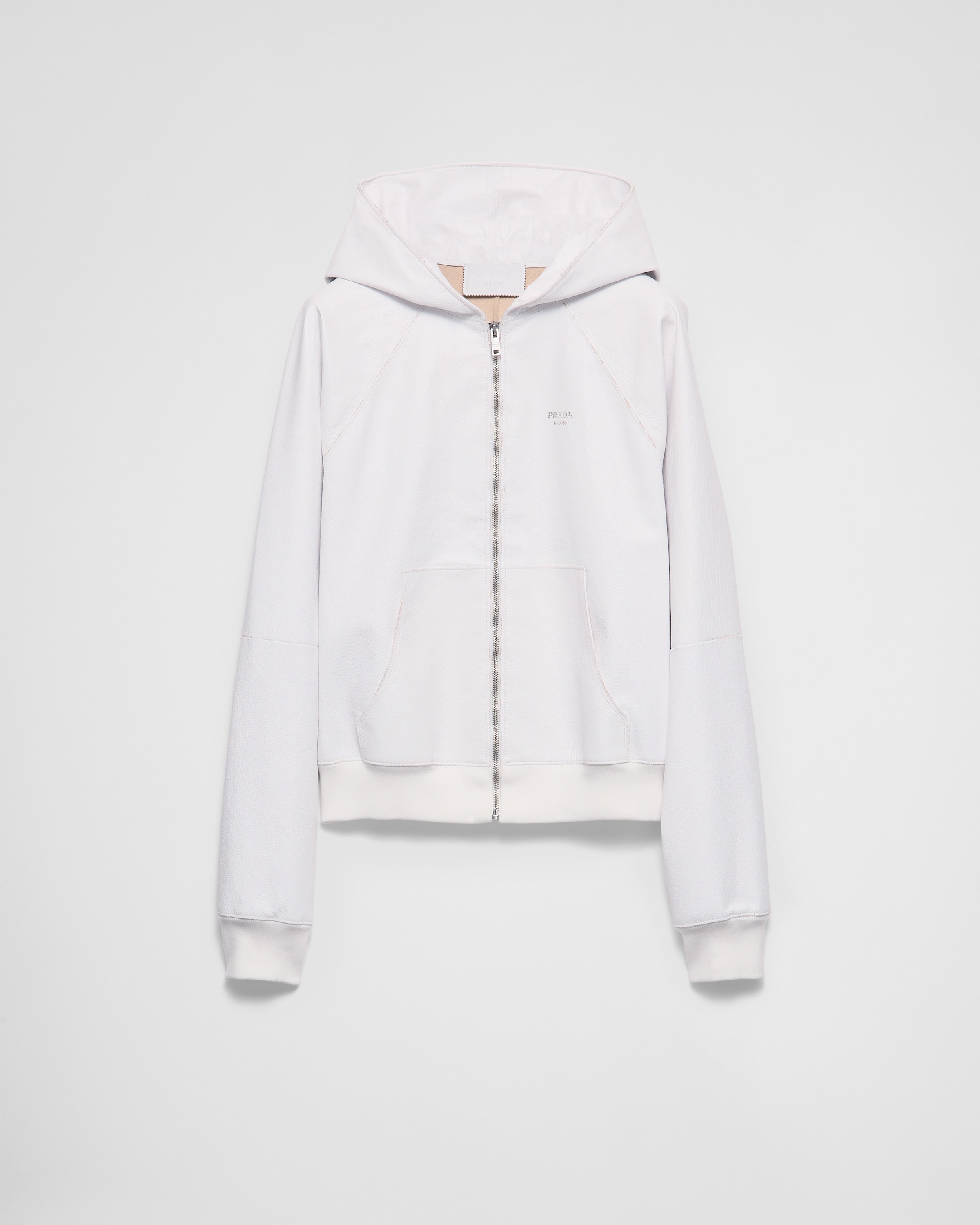 The creative use of materials inspires the hybrid design of this hoodie that combines refined artisan skill and a sporty style. Leather with a vintage effect adds a soft and sophisticated touch to the hooded silhouette decorated with the lettering logo. - Product code: UPW546_16IN_F0009_S_OOO - Unlined - Regular fit - Center zipper closure - Hooded collar - Raglan sleeves and ribbed knit cuffs - Pouch pockets - Ribbed knit hem - Hot-stamped logo - Vintage treatment - Imported - The model is 190 cm tall and wears a size 48 Height: 56cm MATERIALS Main material: Goatskin