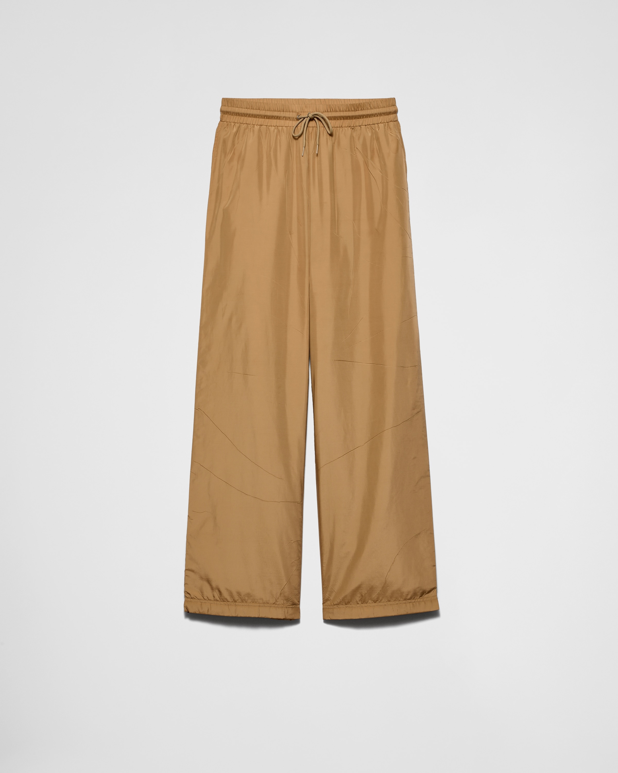 These pants with a sporty design are made of Re-Nylon with a relaxed, wide-leg silhouette completed with the enameled metal triangle logo. For sustainable care to preserve the product's characteristics and reduce microfiber shedding, we recommend not washing the item too often. Let the product air out after every use and have it dry cleaned at a specialized ecological dry cleaners. - Product code: 22H924_1WQ9_F0040_S_OOO - Wide leg fit - Lined - Elasticized drawstring waistband - Angled front slash pockets - Stitched hem - Enameled metal triangle logo - Back patch pocket - Pressed garment - Padded with wadding - The fabric is made with regenerated yarn obtained from recycled plastic materials collected in the ocean. - Imported - The model is 179 cm tall and wears a size 38 Height: 115cm MATERIALS Main material: 100% recycled polyamide