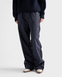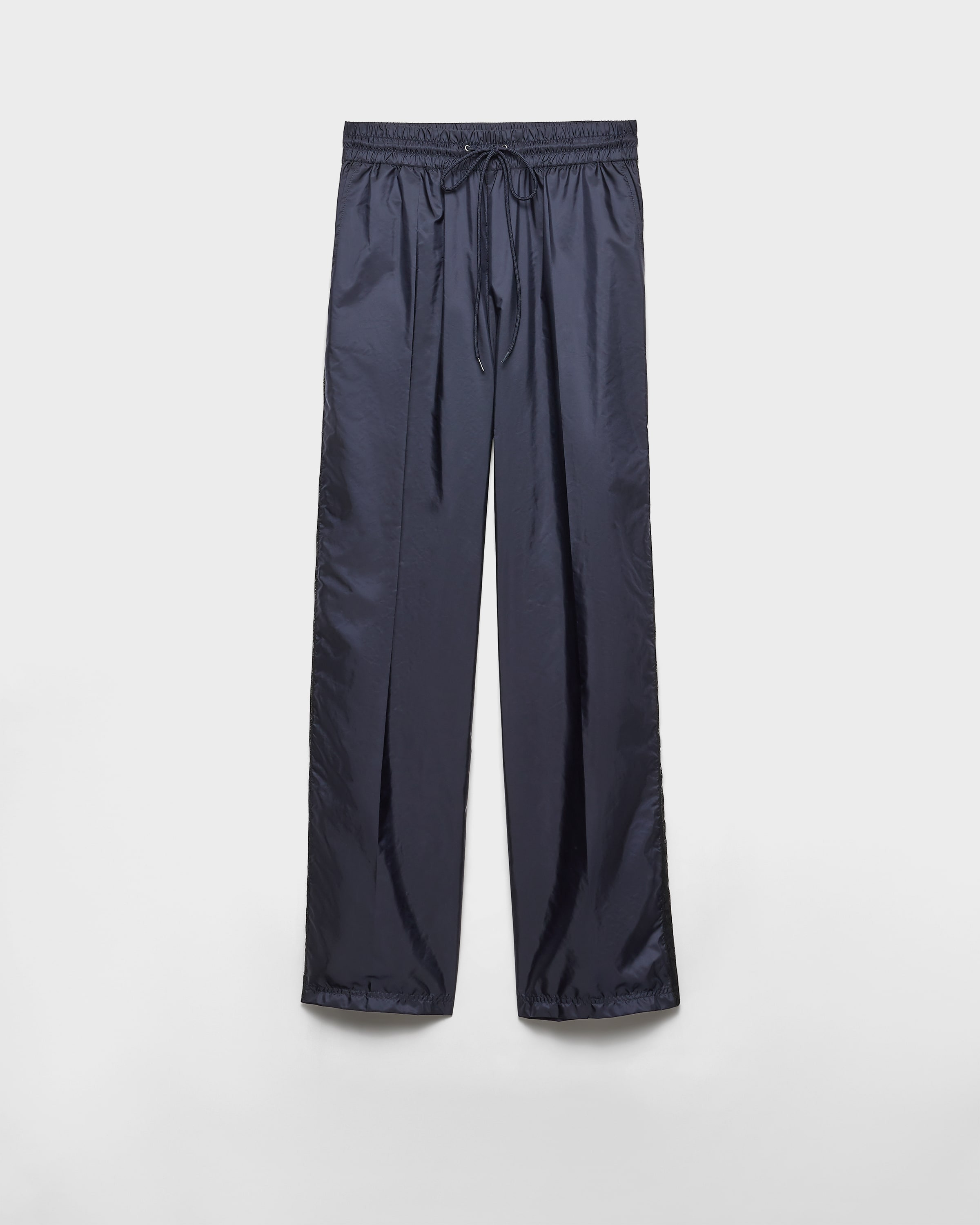 These lightweight Re-Nylon pants have an oversized silhouette and relaxed fit. The style is embellished with lace trim that adds an unexpected, romantic look to the sporty design. For sustainable care to preserve the product's characteristics and reduce microfiber shedding, we recommend not washing the item too often. Let the product air out after every use and have it dry cleaned at a specialized ecological dry cleaners. - Product code: 22X924_1WQ9_F0V41_S_OOO - Wide-leg fit - Unlined garment - Elasticized waist with drawstring - Angled slash pockets - Patch pocket on the back - Stitched hem - Enameled metal triangle logo - Intarsia lace trim down the sides - Pressed garment - Imported - The model is 180 cm tall and wears a size 38 Height: 120cm MATERIALS Main material: 100% recycled polyamide
