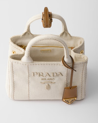 This linen blend bag features a modern design that combines style and practicality. Presented in mini version, the accessory is embellished with the embroidered lettering logo and refined leather details. - Product code: 1BA038_2CX9_F0018_V_8OM - Linen blend handles - Detachable, adjustable logo-print woven tape shoulder strap. Maximum length cm 105 cm - Minimum length 66 cm - Maximum drop 54 cm - Minimum drop 35 cm - Metal hardware - Embroidered logo on the front and enameled metal logo on the key ring - Snap closure on the sides - Linen blend lining with two pockets, including one with zipper - With small purse feet - Imported Height: 15cm Width: 22cm Length: 13cm MATERIALS Main material: Cotton linen