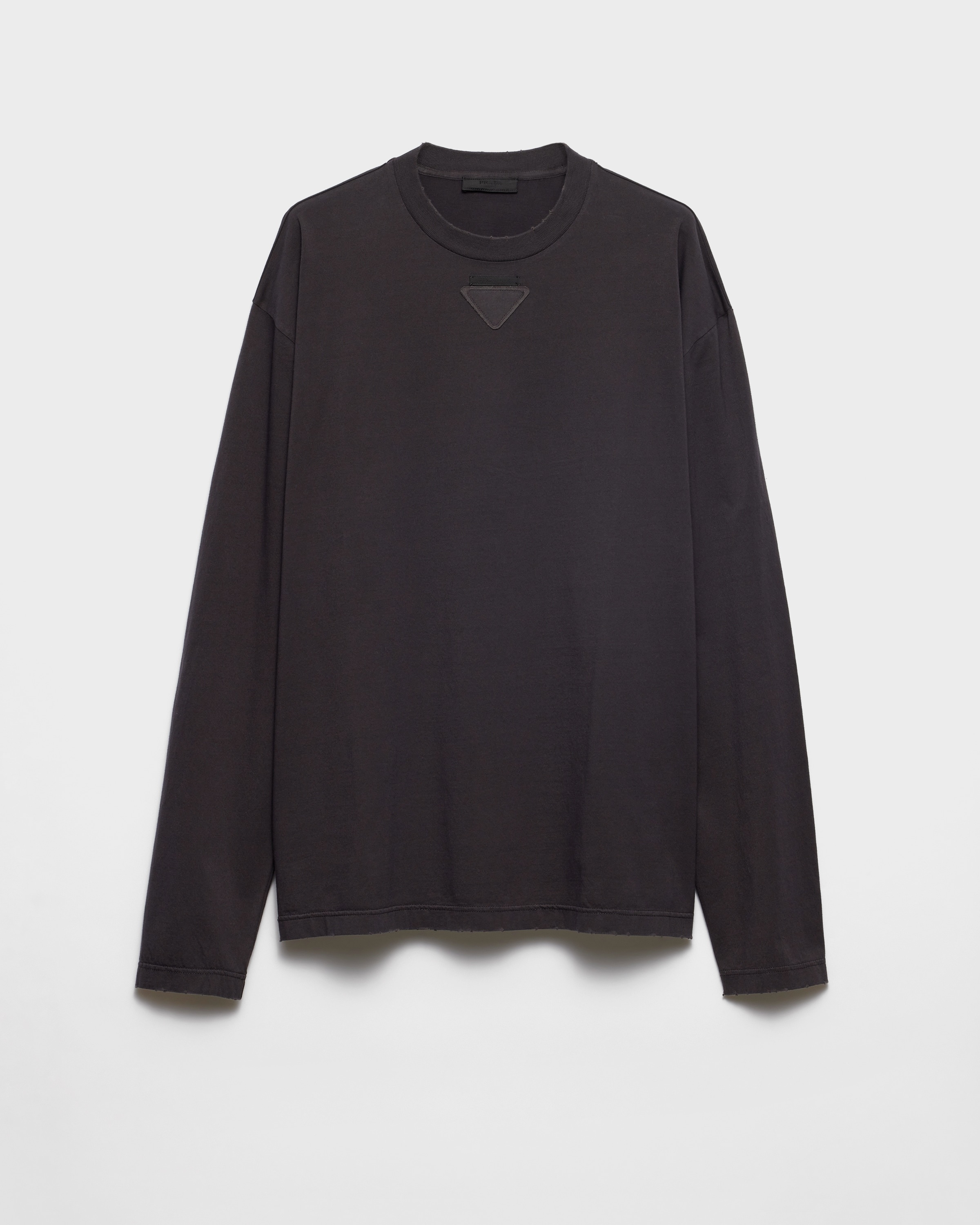 The design of this T-shirt combines a contemporary oversized silhouette with minimalist style details. The soft cotton garment is completed with a ribbed knit crew neck and decorated with the iconic geometric shape of the triangle logo. - Product code: UJL45C_12ZB_F0112_S_OOO - Oversized fit - Long sleeves - Ribbed knit crew-neck - Straight hem - Conceptual triangle logo and sartorial logo label - Length 72 cm. size: M - Imported - The model is 189 cm tall and wears a size 48 Height: 74cm MATERIALS Main material: 100% cotton