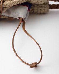 The nautical world inspires the macrame design of this handmade cord bag that embodies fresh elegance and an authentic sense of freedom. This product does not contribute to the SEA BEYOND educational program. - Product code: 1BC111_2DI2_F04HS_V_OOR - Braided leather handles - Removable leather pendant - Metal hardware - Lettering logo stamped on the leather pendant - Removable drawstring pouch, 35cmx29cm - Imported Height: 37cm Width: 30cm MATERIALS Main material: Cotton