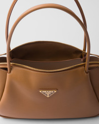 This bag with a sophisticated, contemporary design features simple yet refined details, brightened by the metal hardware. The versatile style has sleek, minimalist lines emphasized by the buttery feel of soft grain leather. The accessory, an expression of exceptional artisanal know-how, is decorated with the iconic enameled metal triangle logo. - Product code: 1BA444_2CYS_F03BH_V_OVX - Metal hardware - Enameled metal triangle logo on the front - Zipper closure - Fabric logo-print lining with three compartments - Imported Height: 16cm Width: 28cm Length: 10.5cm MATERIALS Main material: Calfskin