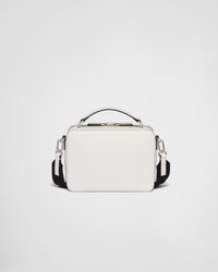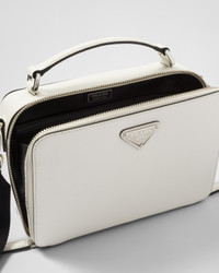 The Prada Brique bag in Saffiano leather stands out for its sleek lines. Saffiano leather, an iconic Prada material, is synonymous with luxury and identifies with traditional Italian leather goods production. - Product code: 2VH069_9Z2_F0009_V_YMI - Leather handle - Detachable adjustable woven nylon and leather shoulder strap - Enameled metal triangle logo on the front - Zipper closure - Ring on the shoulder strap for trick - Lining with patch pocket - Prada logo nylon lining - Imported Height: 16cm Width: 22cm Length: 6cm MATERIALS Main material: Calfskin