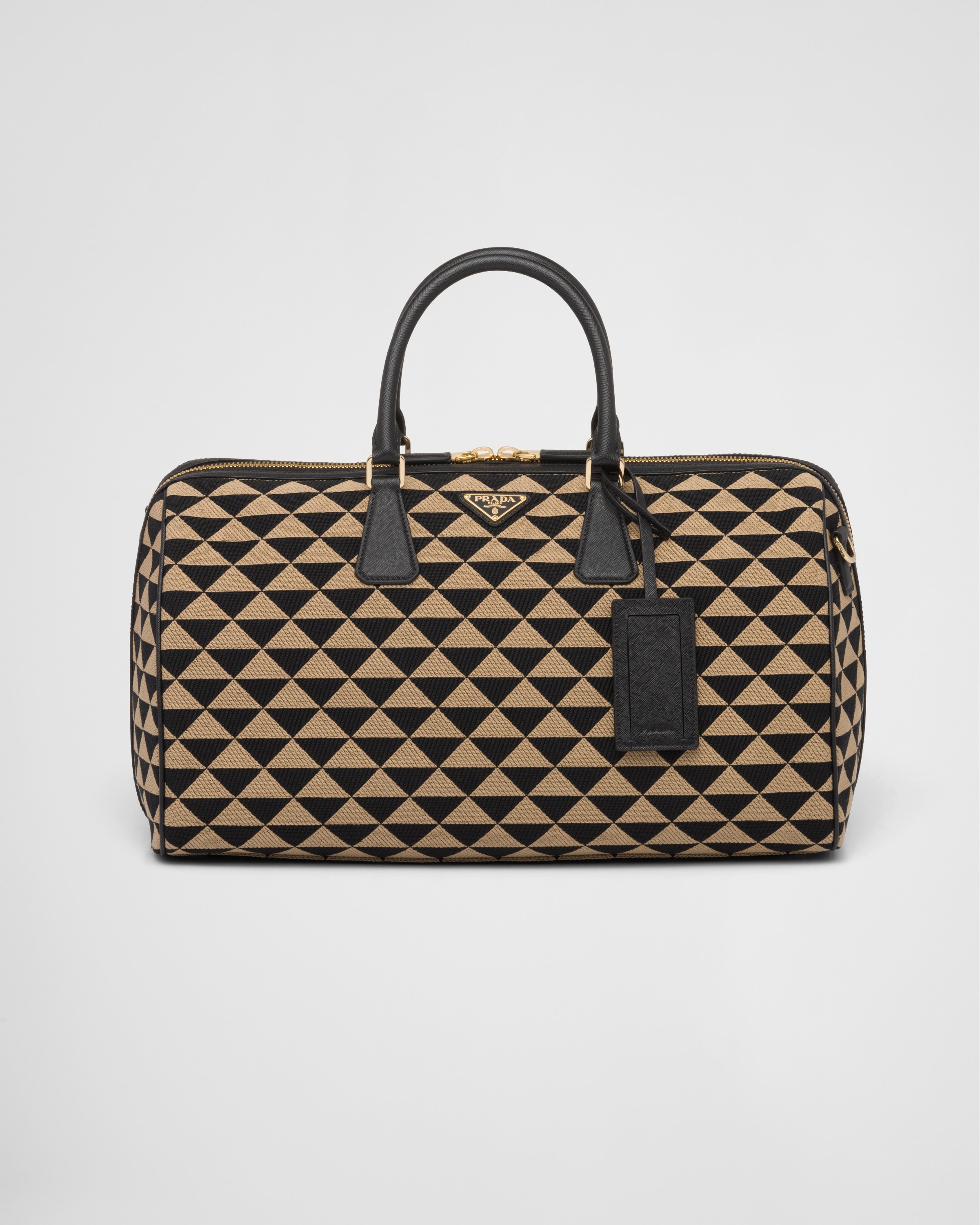 Introduced for the first time on trunks designed by Mario Prada, the Prada triangle expresses uniqueness and modernity through its universal, minimalist shape that is reinvented in a different way each season. Here, the geometric design is transformed into a sophisticated yet modernist pattern that plays with contrasting colors and decorates this travel bag in embroidered fabric. Details in the brand's iconic Saffiano leather embellish the design. - Product code: 2VC034_2FKL_F0Y30_V_OOO - Leather handles - Detachable adjustable woven nylon tape shoulder strap - Enameled metal triangle logo on the front - Zipper closure - Removable leather name tag and keychain - Interior with two zipper pockets - Re-Nylon logo lining - Metal feet - Imported Height: 24.5cm Width: 45cm Length: 23cm MATERIALS Main material: Polyester