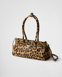 A blend of modernity and tradition defines this leather handbag. The leopard print adds a bold accent to the sophisticated design, elevated by the elegant gold-toned metal hardware and the iconic triangle logo. - Product code: 1BA426_2C7B_F0151_V_MOO - Leather handles, drop 22 cm - Adjustable and detachable shoulder strap. Maximum length 125 cm - Minimum length 105 cm - Maximum drop 60 cm - Minimum drop 50 cm - Metal hardware - Enameled metal triangle logo on the front - Zipper closure - Logo-print nylon lining with zipper pocket - Imported Height: 15.5cm Width: 32cm Length: 12cm MATERIALS Main material: Calfskin