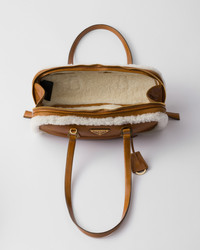 Sleek geometries and winter moods merge in the design of this shearling two-handle bag. This style is easy to carry on the shoulders and features gold-tone hardware, while the triangle logo adds an iconic touch. - Product code: 1BB124_2CTT_F036S_V_DVZ - Leather handles, drop 24 - Adjustable and detachable leather shoulder strap. Maximum length 120 cm - Minimum length 110 cm - Maximum drop 60 cm - Minimum drop 55 cm - Removable key holder - Metal hardware - Enamelled metal triangle logo on the front - Zip closure - Unlined interior - Imported Height: 12cm Width: 27cm Length: 6cm MATERIALS Main material: Lambskin