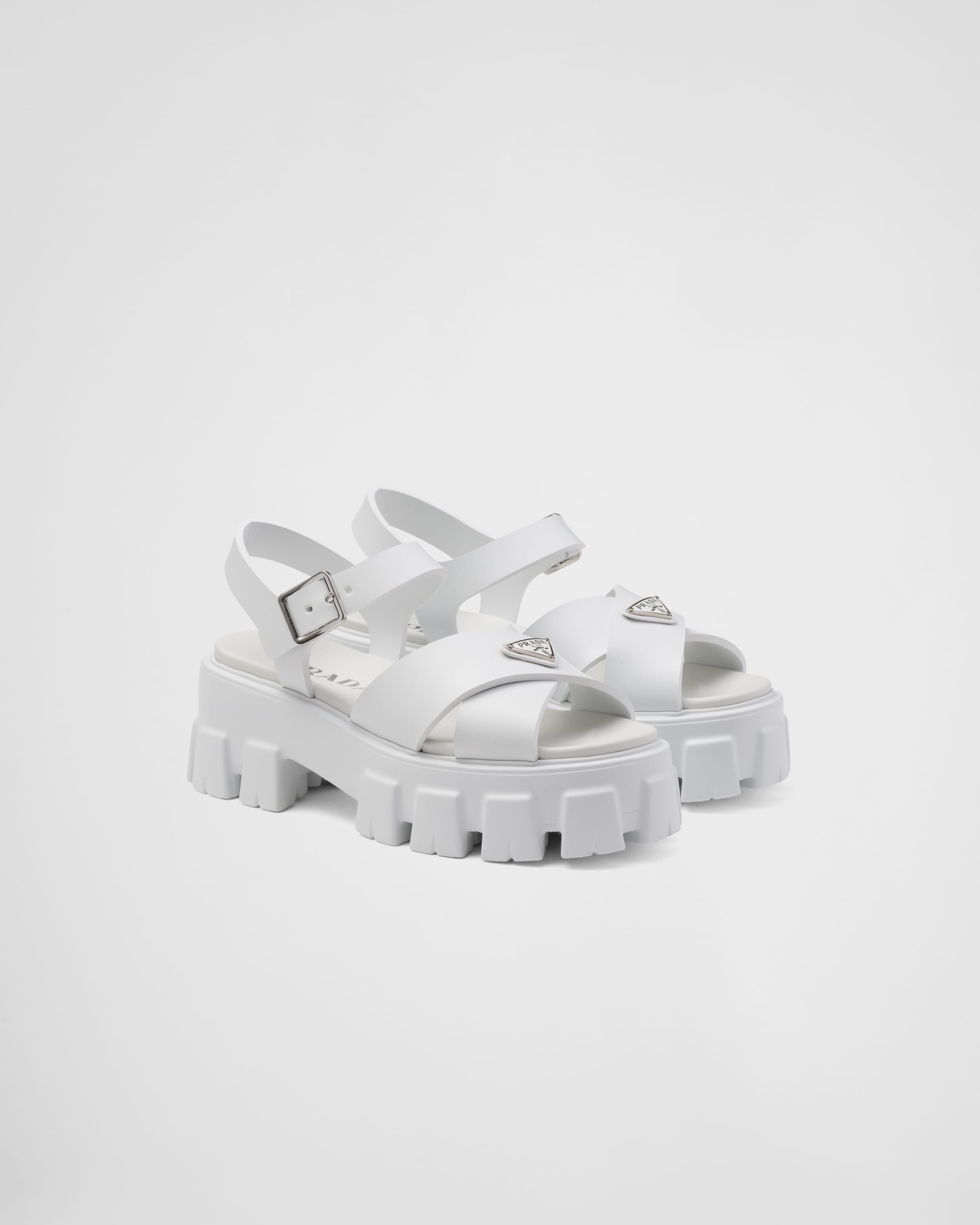 These rubber sandals with sporty touches and contemporary details are an emblem of Prada's unconventional and dual soul. The style characterized by the distinctive Monolith sole is completed by the iconic signature of the enameled metal triangle logo. - Product code: 1X382N_3LKK_F0009_F_055 - Upper with metal buckle - Enameled metal triangle logo - Rubber sole: 55 mm - Lug sole - Imported MATERIALS Main material: Ethyl vinyl acetate - eva