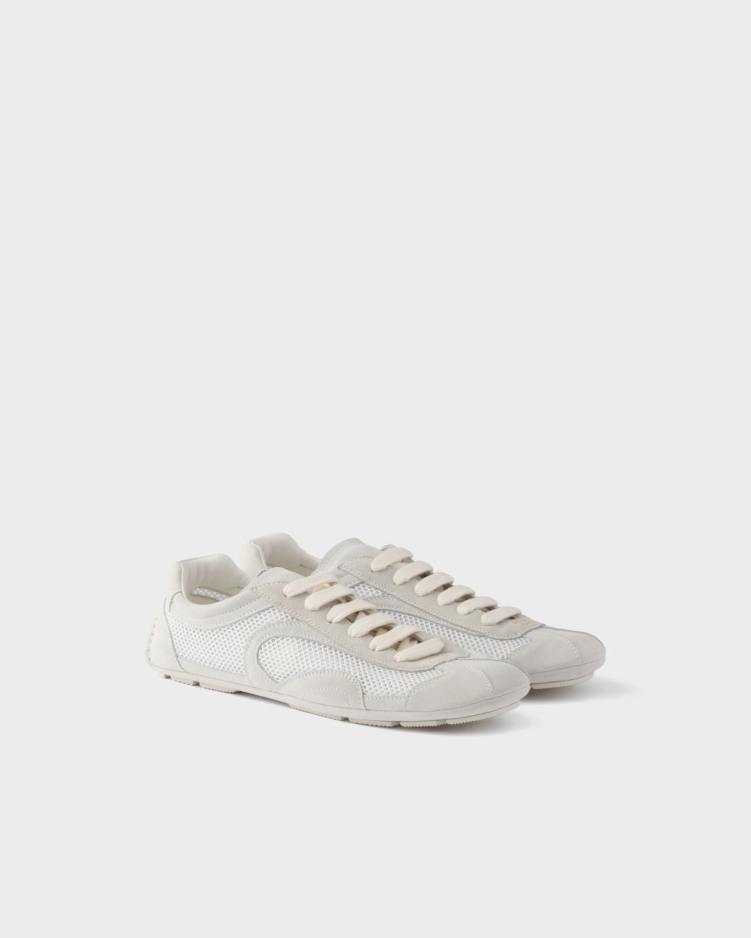 Presented in 2005 for the Linea Rossa collection, Montecarlo sneakers combine style and comfort in a sophisticated and innovative design. In this new interpretation, the footwear returns with a soft, flexible upper in suede and mesh. The silhouette inspired by driving shoes is characterized by deconstructed soles that give the shoe a light look and sleek aesthetic. - Product code: 1E247O_3D8C_F0009_F_D010 - Leather lining - Screen-printed Prada Milano logo - Flat laces closure - Light, flexible rubber sole characterized by a visible lug tread that extends 05 mm beyond the upper - Removable leather-covered insole - Imported MATERIALS Main material: Calfskin