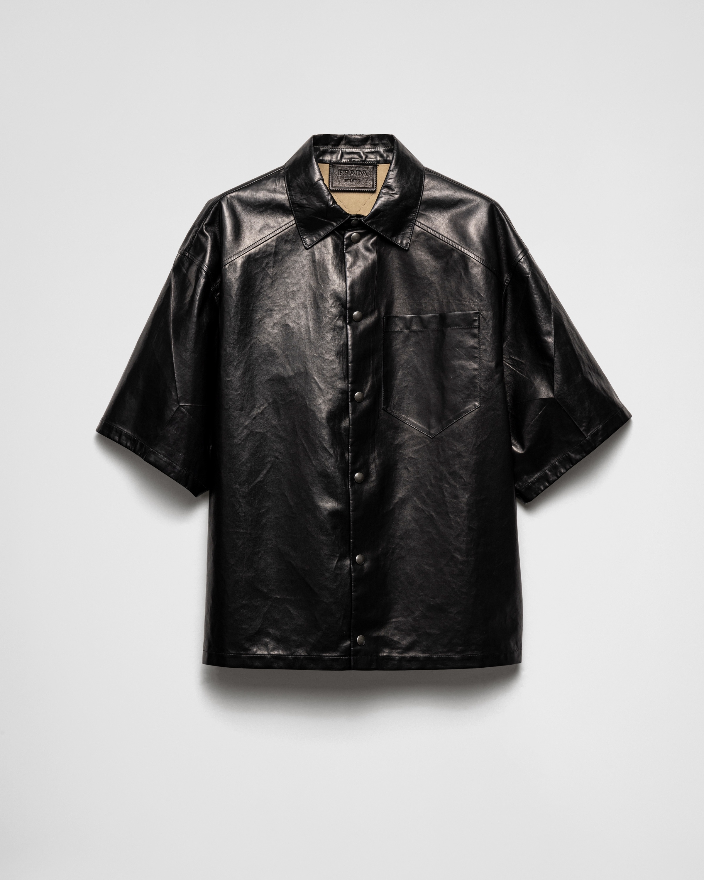 The boxy silhouette of this short-sleeved shirt is reinterpreted with a contemporary design in nappa leather with a minimalist style. - Product code: UPC223_16EB_F049N_S_OOO - Unlined garment - Regular fit - Center button closure - Shirt collar - Short sleeves - Leather triangle logo on the back - Pressed finished garment - Imported - The model is 190 cm tall and wears a size 48 Height: 70cm MATERIALS Main material: Lambskin