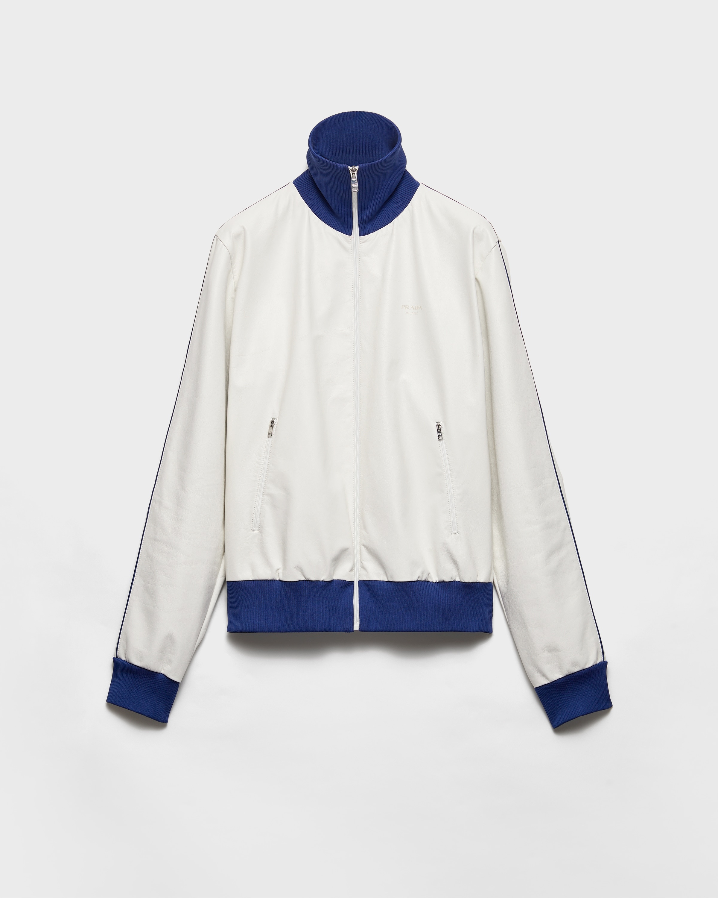 Sophistication and sport meet in the design of this blouson jacket made of soft nappa leather with ribbed knit trim in a contrasting color. The lettering logo adds its signature touch to the contemporary style. - Product code: UPW563_17FH_F0009_S_OOO - Unlined garment - Regular fit - Front zipper closure - Knit collar - Straight sleeves - Ribbed knit cuffs - Welt zipper pockets - Ribbed knit hem - Final waxing treatment - Printed lettering logo - Imported - The model is 190 cm tall and wears a size 48 Height: 62cm MATERIALS Main material: Lambskin
