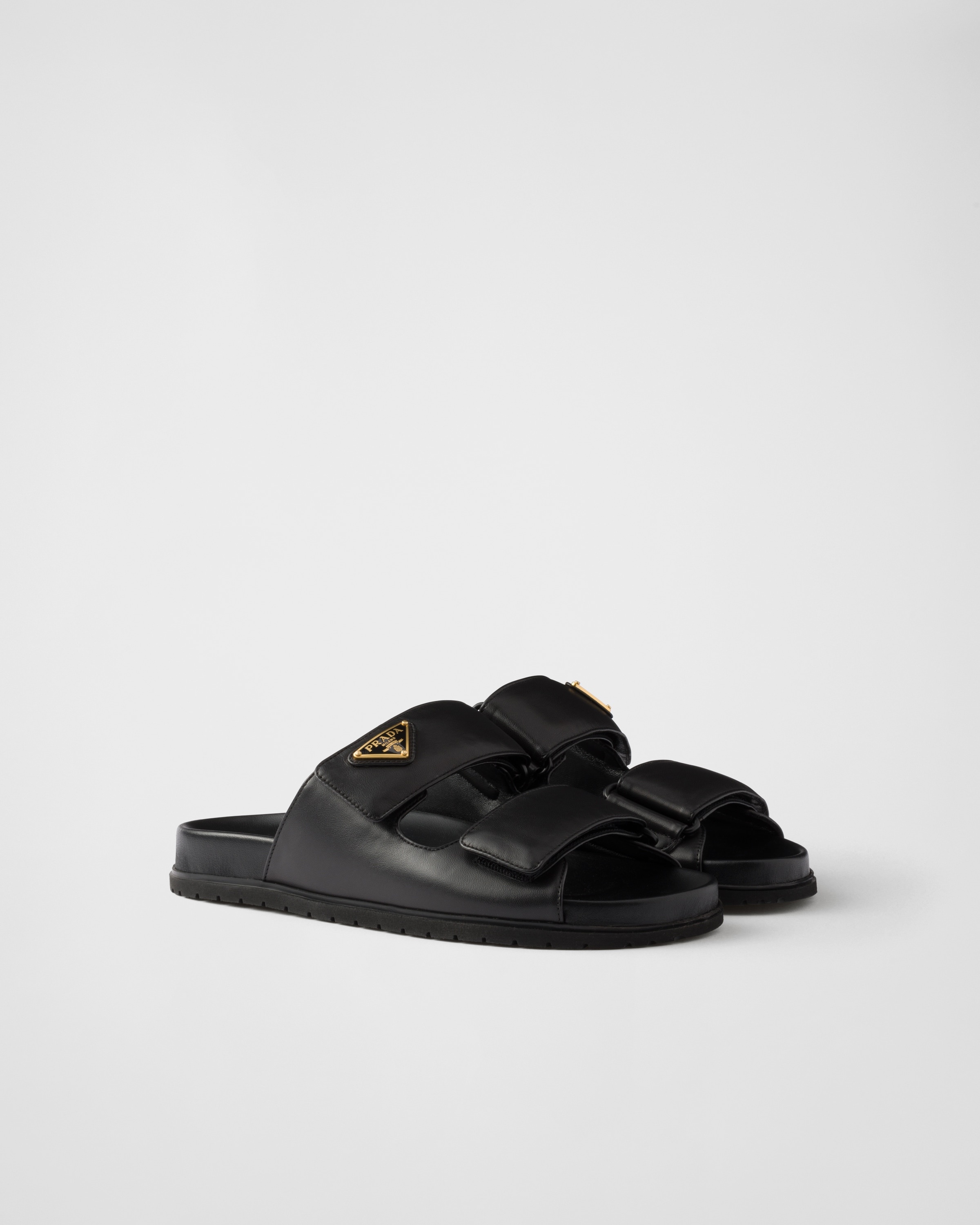 These nappa leather sandals defined by comfortable rubber soles and decorated with the iconic enameled metal triangle logo have a sporty design with refined details. - Product code: 1XX755_038_F0002_F_010 - Upper with hook and loop fastener straps - Enameled metal triangle logo - Rubber sole, 10 mm - Triangle-patterned tread - Imported MATERIALS Main material: Lambskin