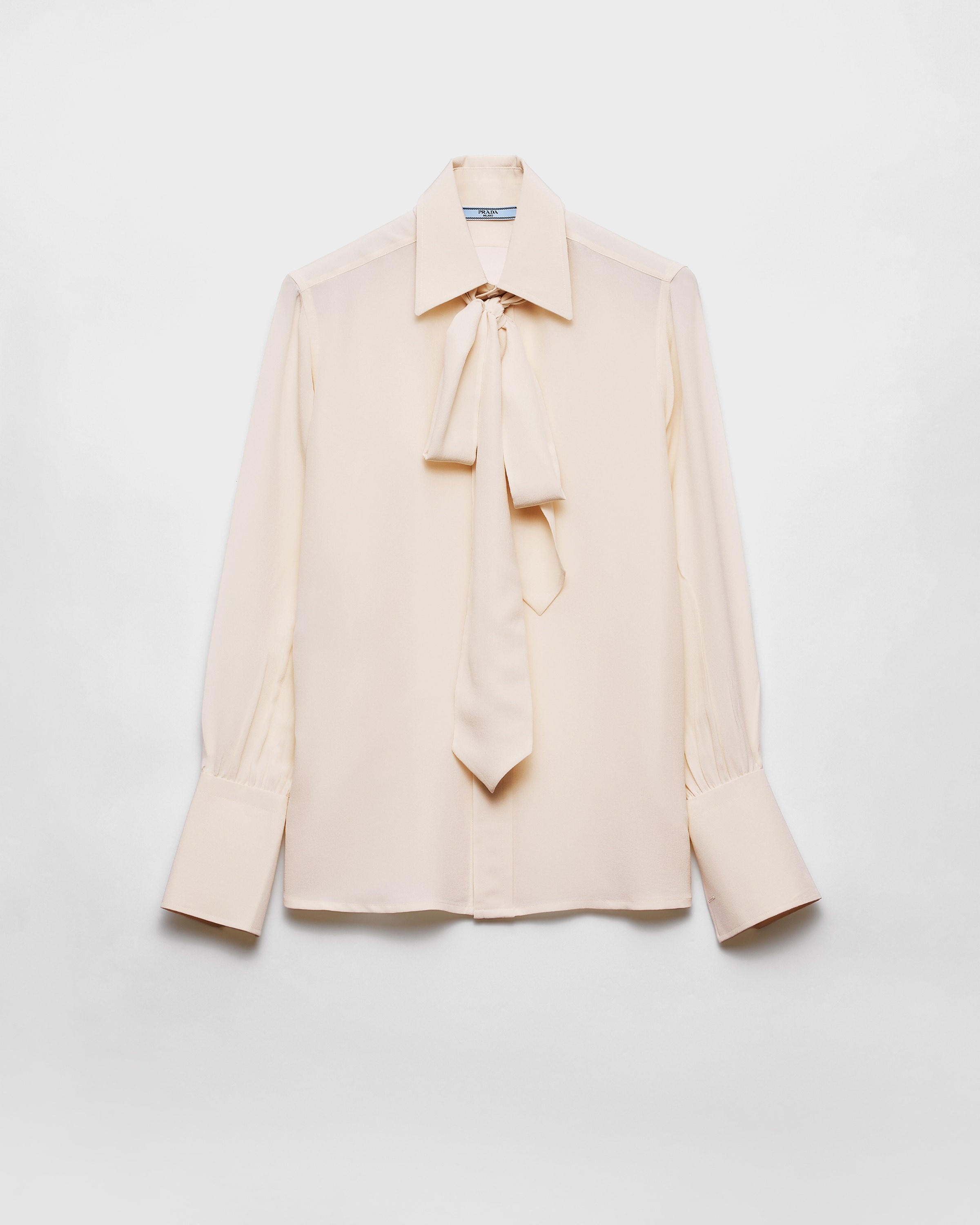 This sophisticated and timeless marocain shirt features a light silhouette defined by formal details and romantic notes. The style is characterized by a deliberate wrinkled effect, a distinctive characteristic of Prada collections. - Product code: P436I_17MB_F0304_S_OOO - Straight fit - Unlined - Classic collar with neck tie - Front button closure - Sleeves with French cuffs - Straight hem - Imported - The model is 178 cm tall and wears a size 38 Height: 68cm MATERIALS Main material: 100% silk