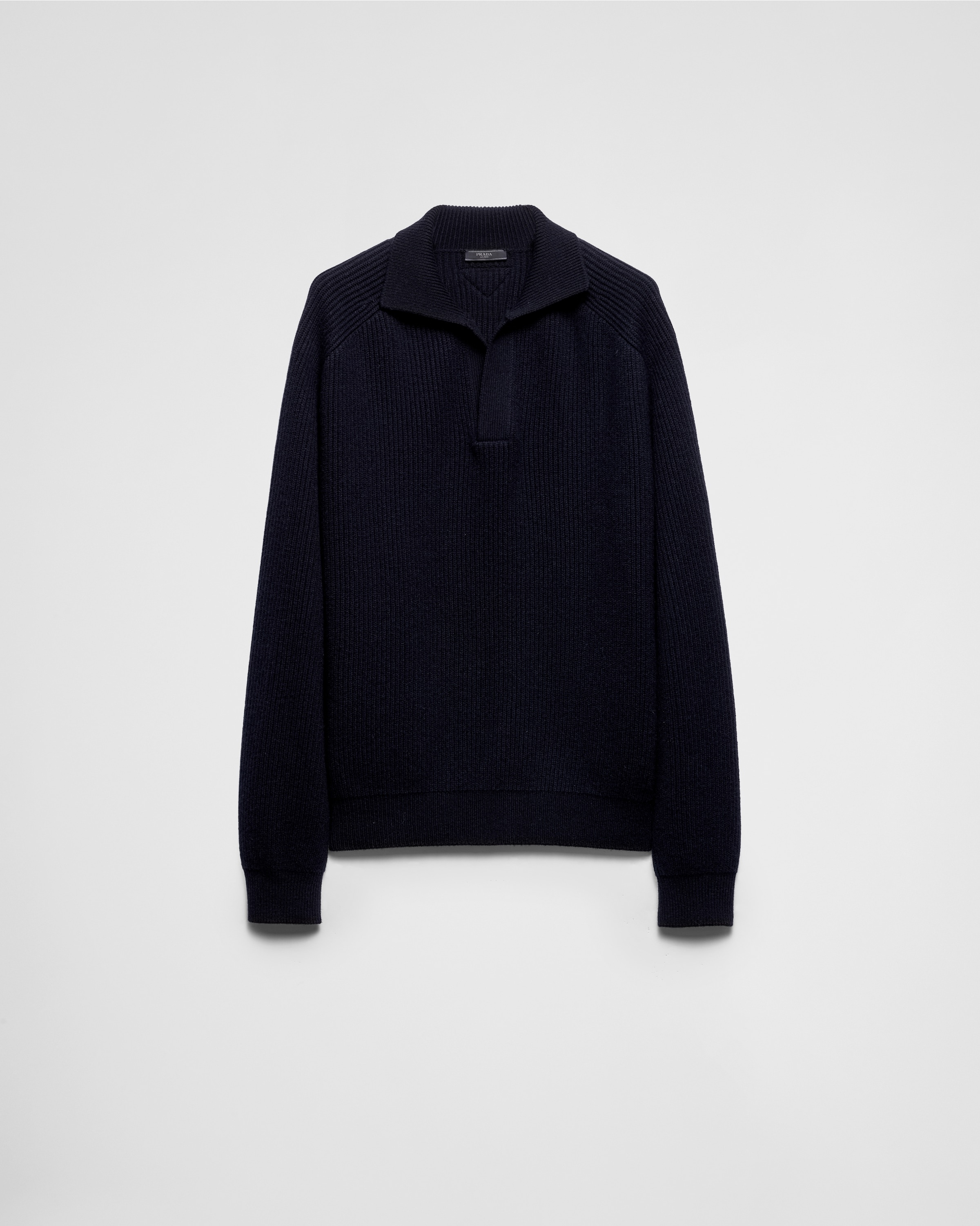 A soft line defines this soft cashmere ribbed knit polo sweater. - Product code: UMB804_14G5_F0008_S_OOO - Ribbed knit - Oversized fit - Polo shirt collar - Regular shoulder - Ribbed knit cuffs and hem - Knit triangle logo - Imported - The model is 189 cm tall and wears a size 48 Height: 68cm MATERIALS Main material: 100% cashmere