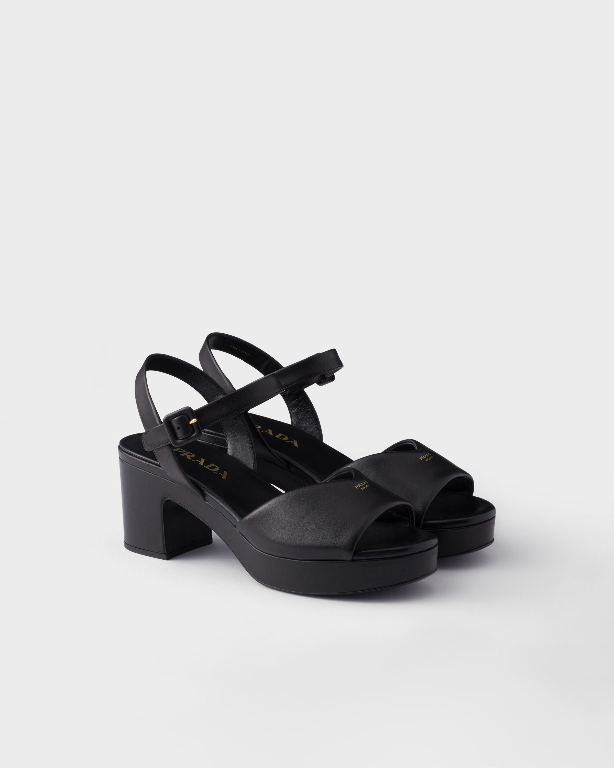 Notes of vintage charm and contemporary lines come together in the design of these nappa leather sandals. The padded upper emphasizes the volumes of the round-toe style with medium heel. The lettering logo completes the shoe with a distinctive, elegant touch. - Product code: 1XZ786_2DL8_F0002_F_D065 - Upper with strap and covered buckle - Screen-printed lettering logo - Leather and rubber sole with metal lettering logo - Leather-covered platform and heel, height 65 mm - Imported MATERIALS Main material: Lambskin