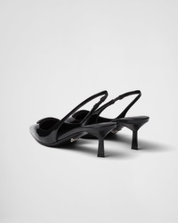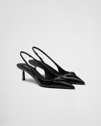 These patent leather pumps express feminine, refined elegance with contemporary allure. The triangle logo returns as a slightly padded leather detail and inspires the geometric line of the heel that enhances the silhouette with a modernist note. - Product code: 1I901M_XUW_F0002_F_DD55 - Screen-printed leather triangle logo - Leather sole and rubber heel cap with metal lettering logo - Varnished heel, height 55 mm - Imported MATERIALS Main material: Calfskin