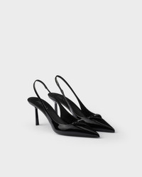 These pointy patent leather slingback pumps with contemporary allure embody refined, feminine elegance. The iconic shape of the triangle logo, reinterpreted with a three-dimensional leather ornament, embellishes the upper and inspires the geometric lines of the heel. - Product code: 1I901M_XUW_F0002_F_DD75 - Screen-printed leather triangle logo - Leather sole with metal lettering logo - Varnished heel, height 75 mm - Imported MATERIALS Main material: Calfskin