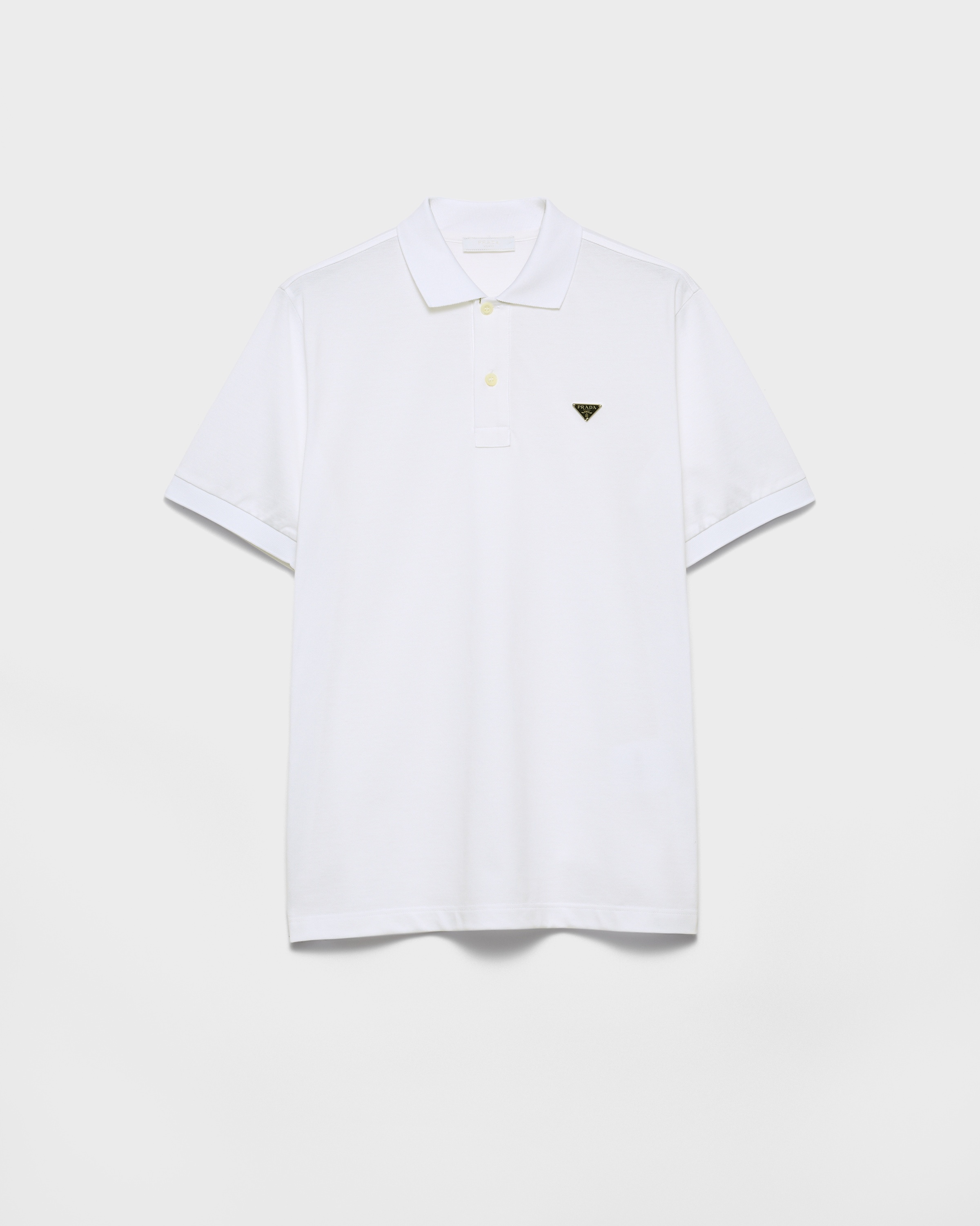 This pique polo shirt, a classic presented in its simplest form, embodies casual chic style. The short-sleeved style is completed with the iconic geometric shape of the tonal triangle logo. - Product code: UJN444_XGS_F0009_S_WM3 - Slim fit - Short sleeves - Ribbed knit collar - Straight hem - Ribbed knit sleeve trim - Mother-of-pearl buttons - Enameled metal triangle logo - Length 68 cm, Size: M - Imported - The model is 191 cm tall and wears a size 48 Height: 68cm MATERIALS Main material: 100% cotton