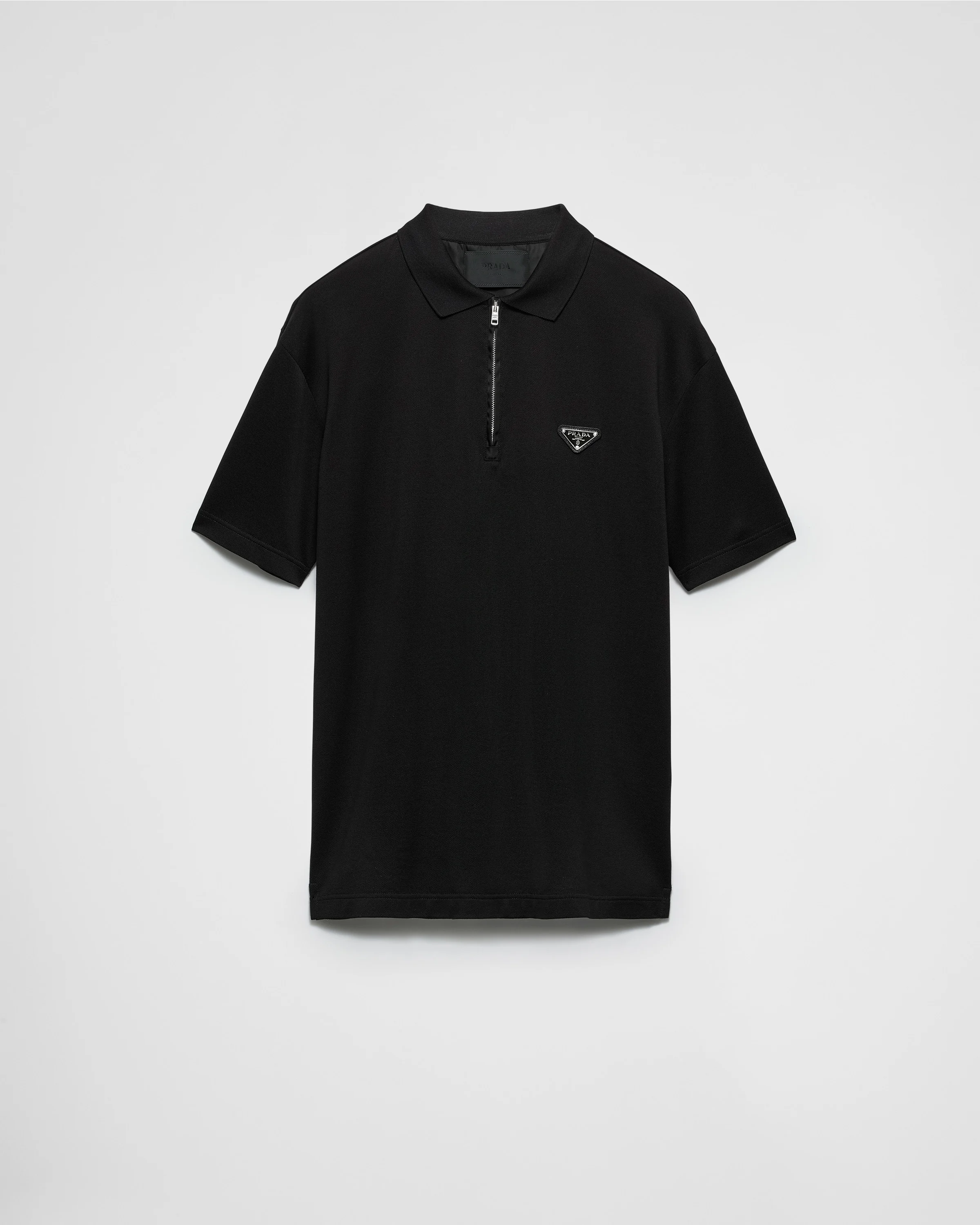 This pique polo shirt, a classic garment presented with a new sporty attitude, has a boxy cut with sleek lines. Re-Nylon details that give a functional character to the short-sleeved silhouette. - Product code: UJN903_1866_F0002_S_WMO - Boxy fit - Short sleeve - Ribbed knit collar - Straight hem - Zipper closure - Enameled metal triangle logo - Length 72 cm, Size: M - Imported Height: 72cm MATERIALS Main material: 100% Cotton
