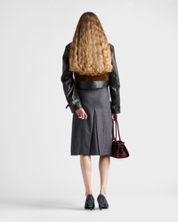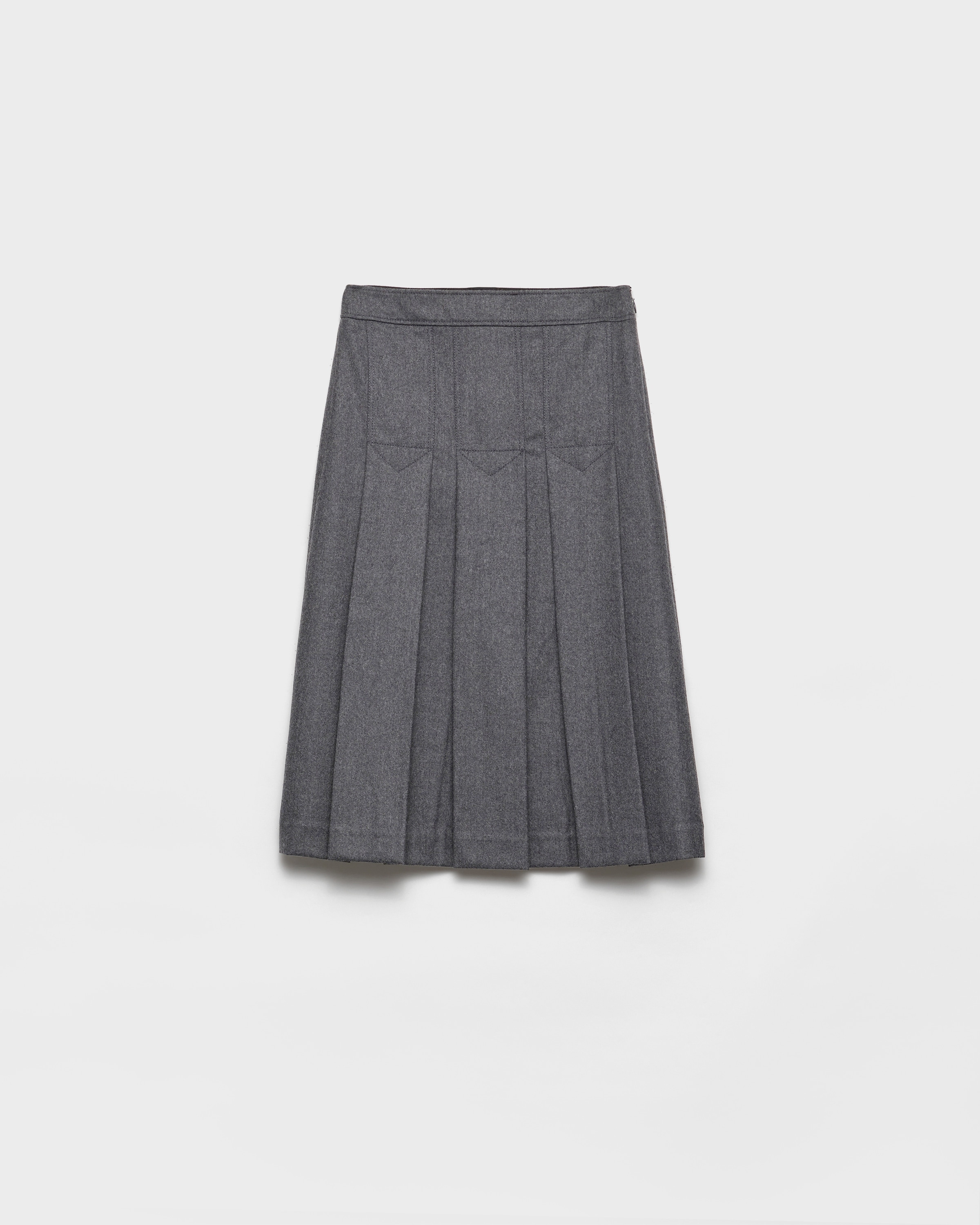 The pleated skirt, a key piece in the Prada wardrobe, is constantly reinterpreted with new fabrics and details that enhance its timeless silhouette. Pure, clean lines define this flannel style that combines femininity and sartorial rigor. - Product code: P109ZG_11GZ_F0480_S_OOO - Flared fit - Inverted back pleat - Side zipper closure with hook - Imported - The model is 180 cm tall and wears a size 38 Height: 75cm MATERIALS Main material: 100% virgin wool