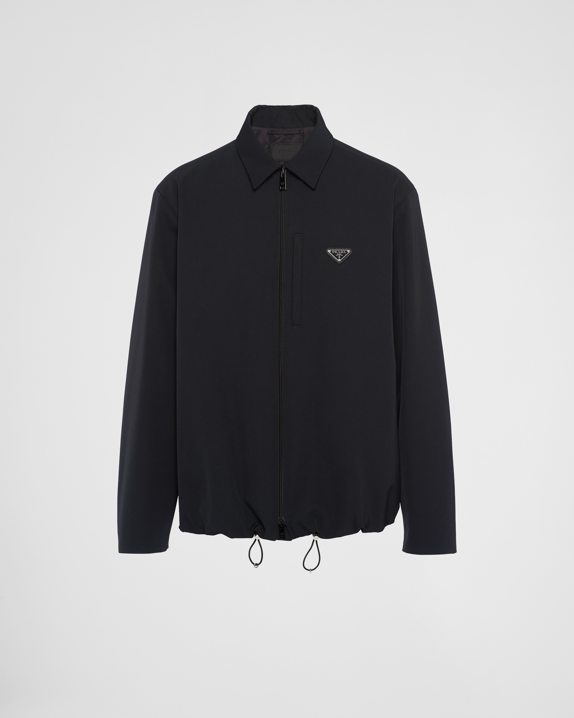This men's shirt with classic collar and straight silhouette turns into a hybrid design thanks to the original zipper closure. The lined and padded garment stands out for its pure lines in a collection that focuses on the quintessence of Prada from which a complex simplicity emerges, mixing sportswear and formal attire, classicism and futurism. - Product code: SC640M_11QL_F0002_S_231 - Oversized fit - Classic collar - Zipper breast pocket - Straight hem - Zipper closure - Lined and padded garment - Enameled metal triangle logo on the front - Imported - The model is 187 cm tall and wears a size 48 Height: 72cm MATERIALS Main material: 11% elastane 89% recycled polyester