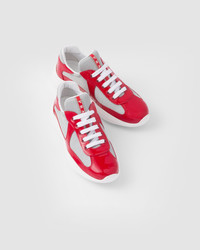 The iconic design of Prada America's Cup combines timeless lines and innovative materials. Cotton laces and an optical patterned tread enhance the product decorated with the Prada Linea Rossa logo badge. - Product code: 3E6420_ASZ_F0011_F_B025 - Technical fabric lining - Prada Linea Rossa latex logo badge - Flat cotton laces - 25 mm rubber sole - Tread with optical pattern - Removable leather-lined insole - Imported MATERIALS Main material: Calfskin