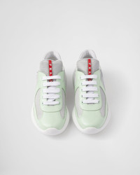 The iconic design of Prada America's Cup combines timeless lines and innovative materials. Cotton laces and an optical patterned tread enhance the product decorated with the Prada Linea Rossa logo badge. - Product code: 3E6420_ASZ_F065J_F_B025 - Technical fabric lining - Prada Linea Rossa latex logo badge - Flat cotton laces - 25 mm rubber sole - Tread with optical pattern - Removable leather-lined insole - Imported MATERIALS Main material: Calfskin
