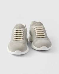 A new version of an icon. The America's Cup sneakers in suede maintain their distinctive line and lightness but have a soft, new upper. - Product code: 4E3400_Z5O_F0031_F_G000 - Enameled metal eyelets and cotton laces - Prada red label applied on the tongue - Laced style - Light expanded rubber sole - Sole height, 35 mm - Removable leather-covered insole - Imported MATERIALS Main material: Calfskin