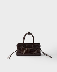 A symbol of innovation, unconventional spirit and a timeless attitude, the Bonnie bag expresses Prada's dialogue with modernity. The style is presented in a versatile and compact mini format enriched with distinctive metal buckles and laces on the sides. Soft leather with a liquid, glossy finish gives the design unmistakable style. - Product code: 1BA486_2CYR_F01D6_V_OOO - Leather handles, drop 10 cm - Detachable, adjustable leather shoulder strap. Maximum length 125 cm - Minimum length 105 cm - Maximum drop 60 cm - Minimum drop 50 cm - Metal hardware - Enameled metal triangle logo on the front - Zipper closure - Logo-print nylon lining with zipper pocket - Imported Height: 12cm Width: 23.5cm Length: 9cm MATERIALS Main material: Calfskin