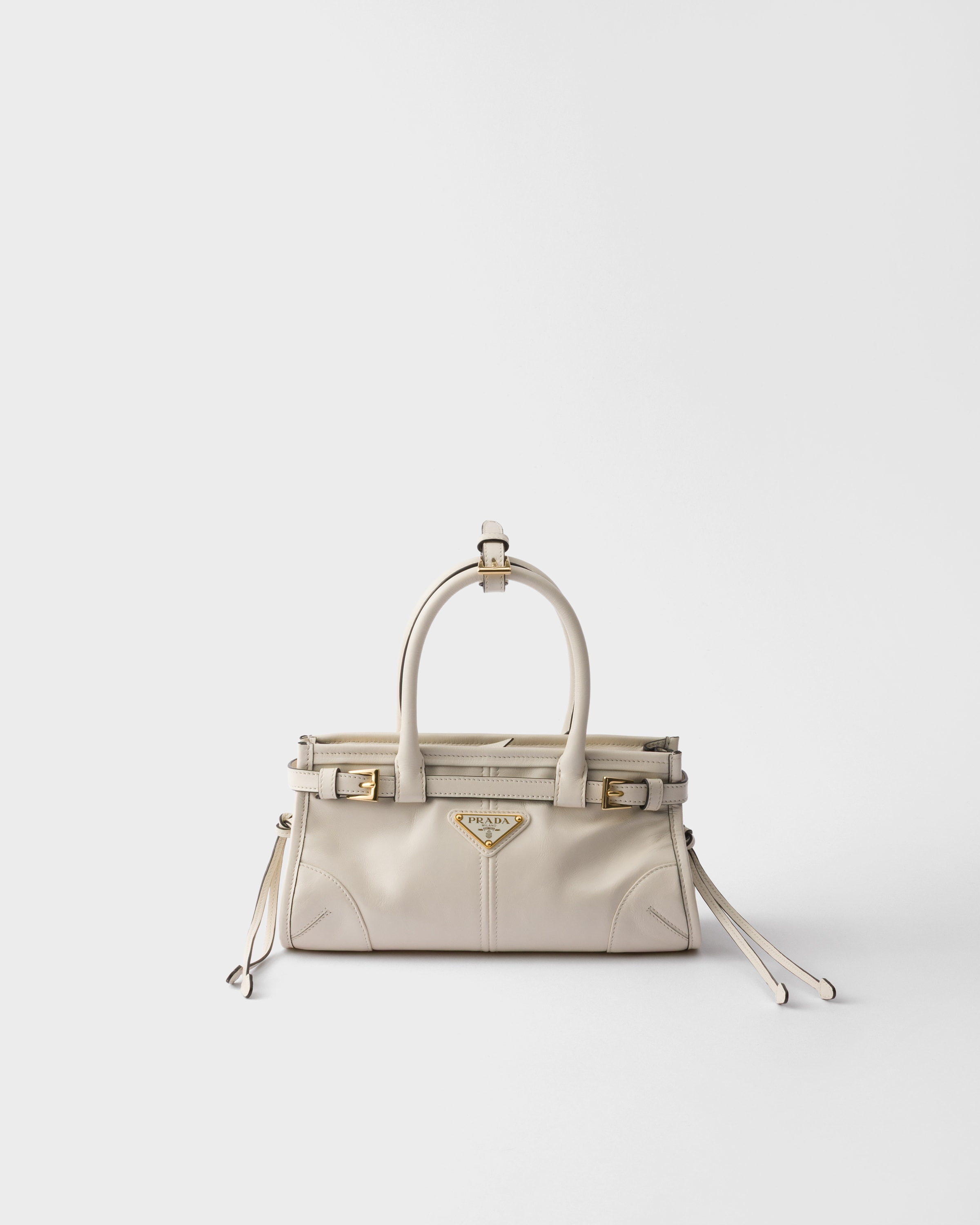 A symbol of innovation, unconventional spirit and a timeless attitude, the Bonnie bag expresses Prada's dialogue with modernity. The style is presented in a versatile and compact mini format enriched with distinctive metal buckles and laces on the sides. Soft leather with a liquid, glossy finish gives the design unmistakable style. - Product code: 1BA486_2CYR_F0PG7_V_OOO - Leather handles, drop 10 cm - Detachable, adjustable leather shoulder strap. Maximum length 125 cm - Minimum length 105 cm - Maximum drop 60 cm - Minimum drop 50 cm - Metal hardware - Enameled metal triangle logo on the front - Zipper closure - Logo-print nylon lining with zipper pocket - Imported Height: 12cm Width: 23.5cm Length: 9cm MATERIALS Main material: Calfskin