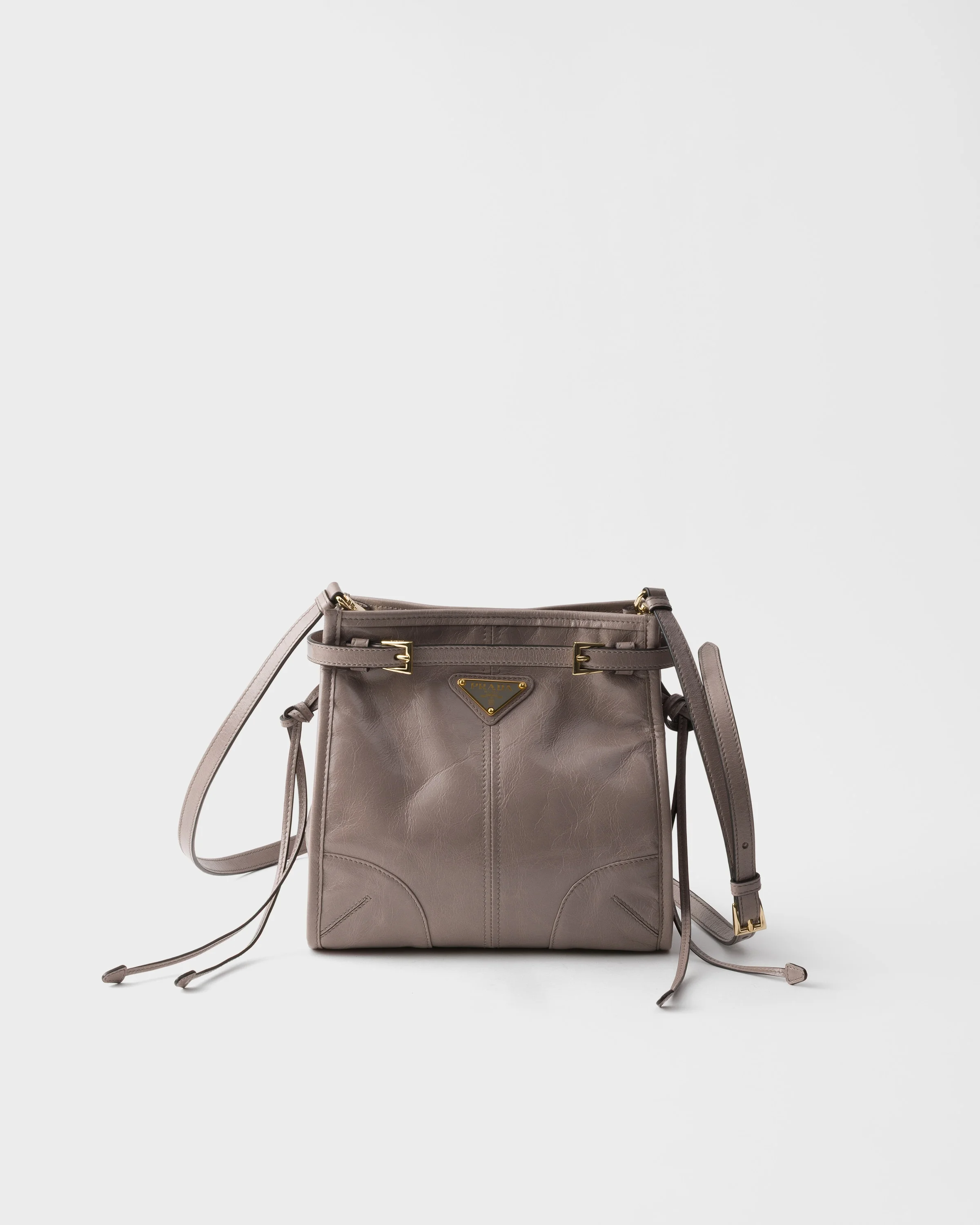 An icon transformed: The Bonnie bag is a silhouette with shoulder strap that enhances the versatile essence of the style. The new sophisticated and compact shape is enriched by soft leather that has been carefully crafted to achieve an exclusive, glossy sheen. The unmistakable belt detail frames the accessory decorated with the enameled metal triangle logo. - Product code: 1BH229_2CYR_F03SF_V_OOO - Adjustable, detachable leather shoulder strap with shoulder pad. Maximum length 105 cm - Minimum length 95 cm - Maximum drop 55 cm - Minimum drop 50 cm - Metal hardware - Enameled metal triangle logo on the front - Magnetic closure - Logo-print nylon lining with patch pocket - Imported Height: 20cm Width: 19.5cm Length: 7cm MATERIALS Main material: Calfskin