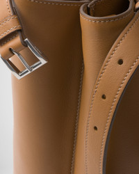 Clean lines and refined elements tell the story of Prada's dual aesthetic that blends simplicity and detail, functionality and elegance. This leather bag summarizes the brand's stylistic codes in a pragmatic but sophisticated design, with nappa leather interior. The spacious silhouette is animated by the distinctive touch of the leather belts, both refined and modern. The hot-stamped lettering logo in 22 kt gold leaf adds a precious signature to the bag. - Product code: 2VG126_2CYS_F03BH_V_OOO - Leather handles - Detachable, adjustable leather shoulder strap - Metal hardware - Lettering logo printed on the front - Nappa interior with center pocket - Imported Height: 34cm Width: 48cm Length: 18cm MATERIALS Main material: Calfskin