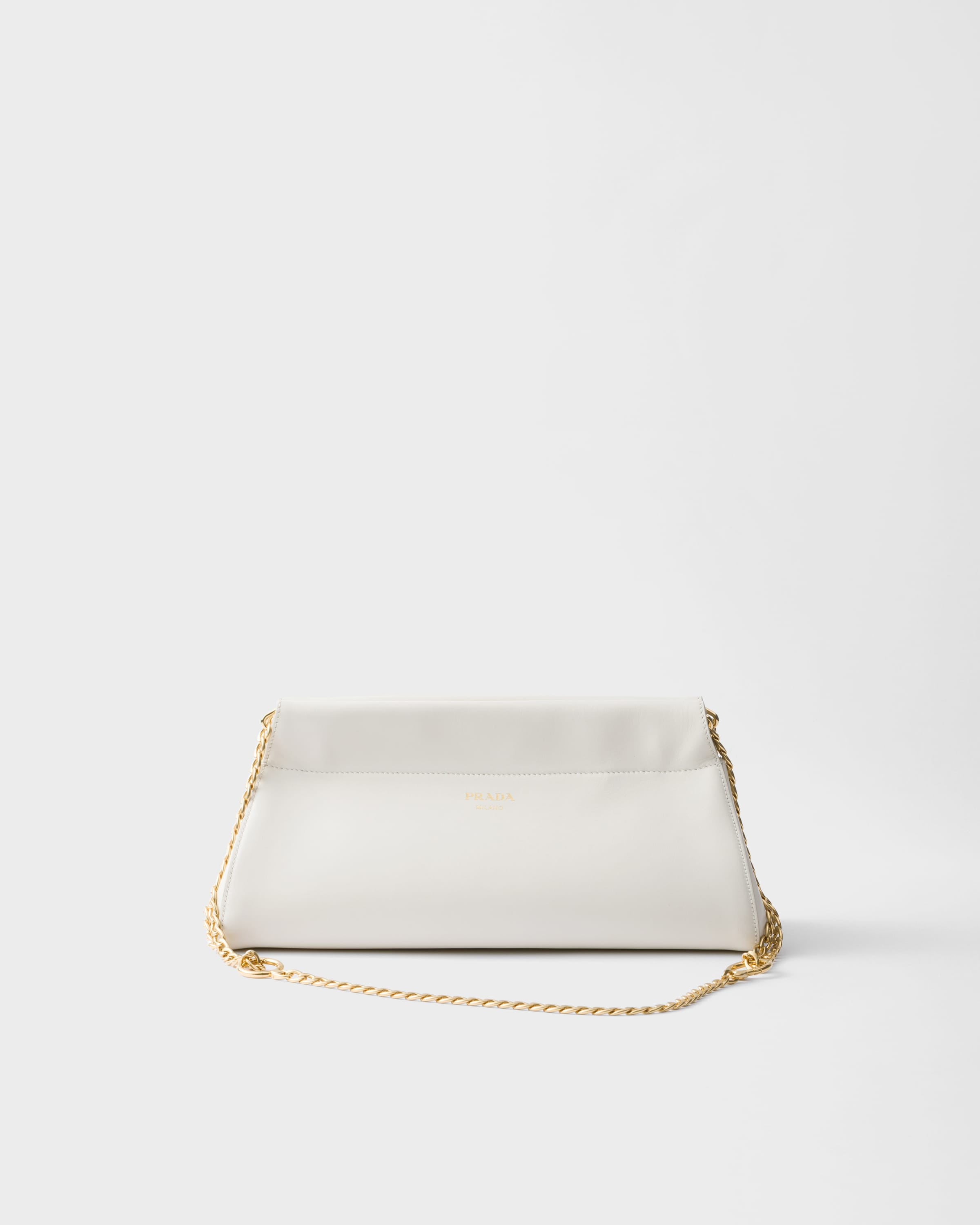 The contemporary and feminine Enchaine bag takes and transforms a silhouette with vintage charm with new volumes and proportions. The leather design is embellished with chain handles that suggest a modern and sophisticated gesture. - Product code: 1BC262_2HIA_F0009_V_COO - Chain handles, drop 35 cm - Metal hardware - Hot-stamped lettering logo on the front - Nappa leather interior with zipper pocket - Imported Height: 15.5cm Width: 32.5cm Length: 11.5cm MATERIALS Main material: Calfskin