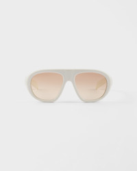 Acetate sunglasses with an oversized design. The frame features an oversized pilot silhouette and large volumes that give it a contemporary, feminine look. The rounded temples are decorated with the enameled Prada logo. - Product code: SPRC05_E17K_FE20S_C_057 - Recycled bio-acetate frame front - Color: Chalky White - Frame compatible with graduated lenses - 100% UVA / UVB protection - Standard Fit - Lens-nose-temple measurement: 57-18-135 mm - Article comes with dedicated packaging - Other colors available - Imported MATERIALS Acetate