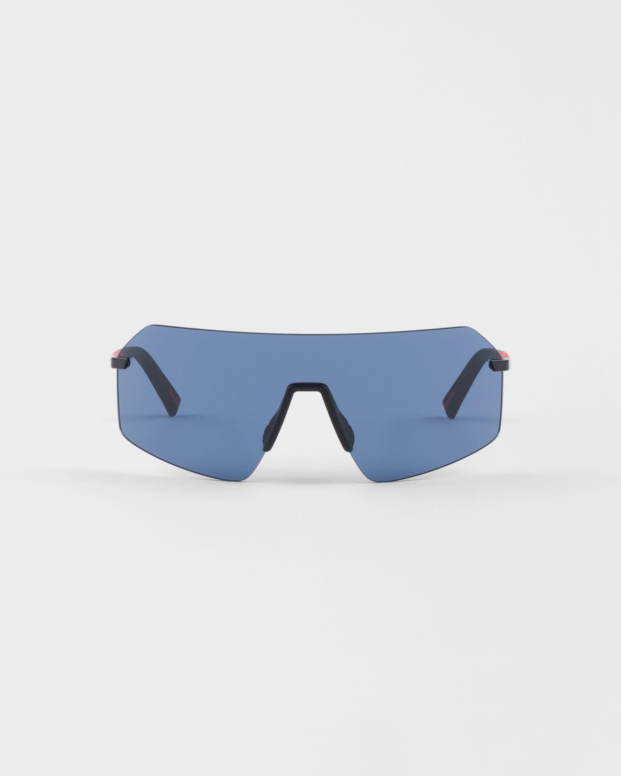 Sunglasses with a contemporary wraparound design. The ultra-light frame features a rimless lens with clean edges, characterized by the Prada logo lasered on the front and an ergonomic rubber nose pad that guarantees a comfortable fit. The slim temples are decorated with the Prada Linea Rossa logo. - Product code: SPSB50_E1BO_FE06A_C_036 - Metal frame front - Color: Opaque Black - Frame not compatible with graduated lenses - 100% UVA / UVB protection - Adjustable nose pads suitable for any fit - Lens-nose-temple measurement: 136 - 130 mm - Article comes with dedicated packaging - Other colors available - Imported MATERIALS Metal