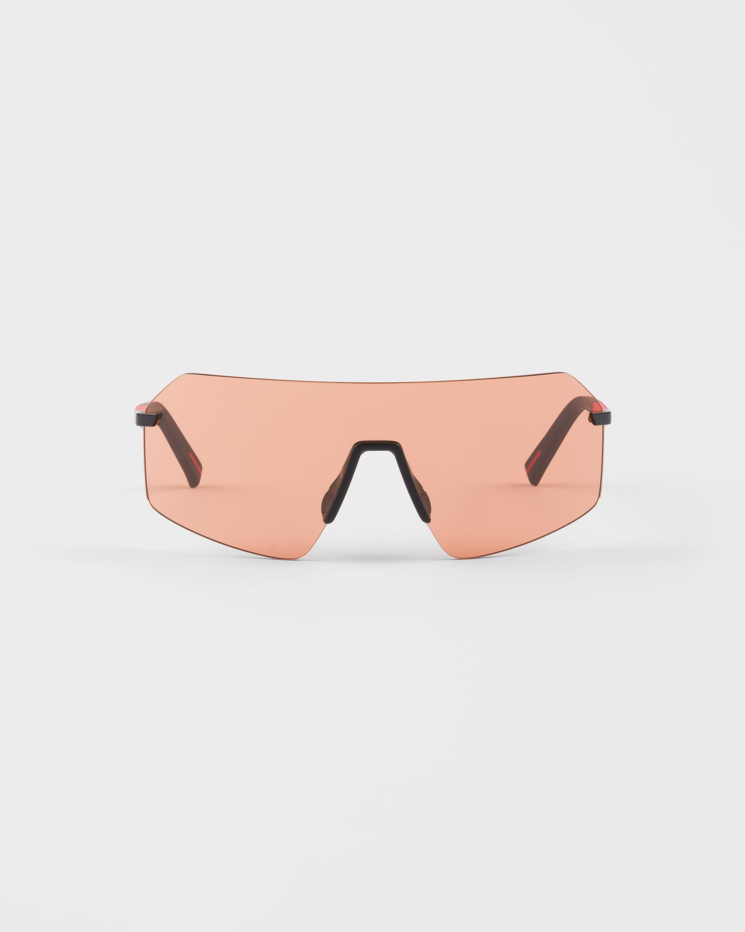 Sunglasses with a contemporary wraparound design. The ultra-light frame features a rimless lens with clean edges, characterized by the Prada logo lasered on the front and an ergonomic rubber nose pad that guarantees a comfortable fit. The slim temples are decorated with the Prada Linea Rossa logo. - Product code: SPSB50_E1BO_FE90U_C_036 - Metal frame front - Color: Opaque Black - Frame not compatible with graduated lenses - 100% UVA / UVB protection - Adjustable nose pads suitable for any fit - Lens-nose-temple measurement: 136 - 130 mm - Article comes with dedicated packaging - Other colors available - Imported MATERIALS Metal