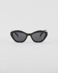 Acetate sunglasses with a feminine cat-eye design. The geometric temples are emphasized by a refined play of bonded elements that highlights the iconic triangle logo in a contrasting color. - Product code: SPRA02_E16K_FE08Z_C_052 - Recycled bio-acetate frame front - Color: Black - Frame compatible with graduated lenses - 100% UVA / UVB protection - Standard Fit - Lens-nose-temple measurement: 52-19-140 mm - Article comes with dedicated packaging - Imported MATERIALS Acetate