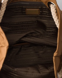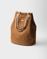 Original combinations animate this Re-Nylon bag inspired by the timeless codes of nautical style. The soft, roomy silhouette is characterized by sliding handles made of cord and leather, in contrast with the functional texture of Re-Nylon. For sustainable care to preserve the product's characteristics and reduce microfiber shedding, we recommend not washing the item too often. Let the product air out after every use and have it dry cleaned at a specialized ecological dry cleaners. - Product code: 2VG133_2HG8_F0134_V_OOO - Sliding cord and skin handles - Enameled metal triangle logo on the front - Interior with zipper pocket - Logo-print Re-Nylon lining - Imported Height: 44cm Width: 34cm Length: 24cm MATERIALS Main material: Recycled polyamide