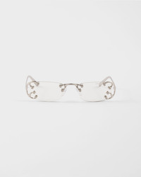 A sophisticated, unconventional design characterizes the new eyewear of the Fall/Winter 2025 show. The rectangular frame features a construction with rimless lenses emphasized by exclusive metal details inspired by typical Art Nouveau style elements. The straight temples feature the signature touch of the Prada lettering logo. - Product code: SPRC57_S28H_FE08N_C_052 - Metal frame front - Color: Nouveau Silver - Frame not compatible with graduated lenses - 100% UVA / UVB protection - Blue Light lenses without prescription have a special filter to reduce exposure to the blue light of digital devices and sunlight. - Adjustable nose pads suitable for any fit - Lens-nose-temple measurement: 52-20-135 mm - Article comes with dedicated packaging - Other colors available - Imported MATERIALS Metal