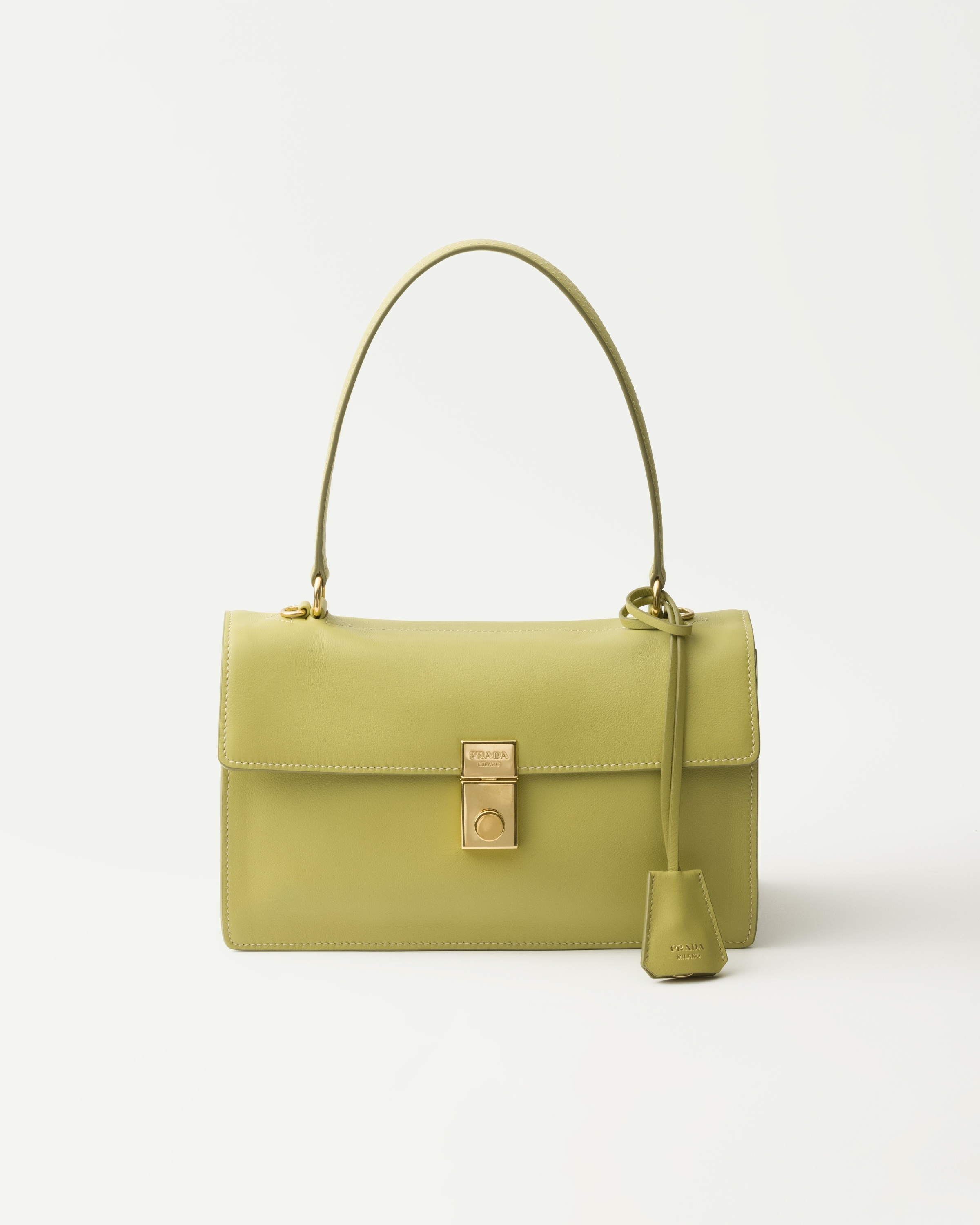 Inspired by rigid, formal work bags, this leather bag is a reinterpretation of the classic office silhouette with a new attitude. The archetypal shape is softened and enriched with sophisticated, feminine details. The vertical clasp, taken from the archives, embellishes the accessory characterized by a long handle that can be worn over the shoulder. - Product code: 1BN023_2CYS_F0362_V_TOO - Leather handle, drop 20 - Detachable, adjustable leather shoulder strap. Maximum length 110 cm - Minimum length 100 cm - Maximum drop 57 cm - Minimum drop 52 cm - Metal hardware - Lettering logo engraved on clasp - Flap closure with push-lock clasp - Nappa leather lining with two compartments and two pockets, including one with zipper - Imported Height: 16cm Width: 28cm Length: 10cm MATERIALS Main material: Calfskin