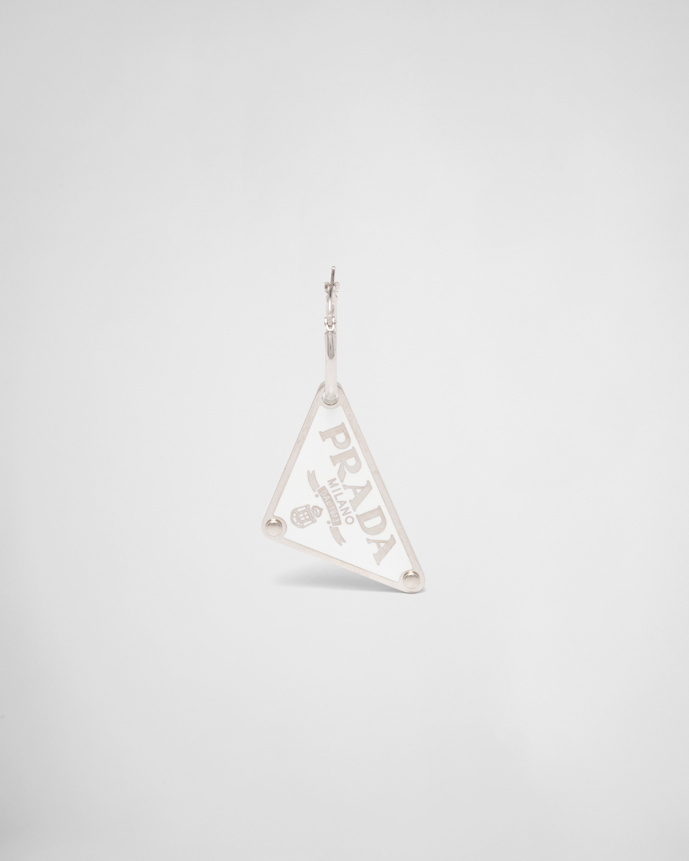 Iconic and sleek, the triangle logo is the protagonist of a new line of jewelry made of 925 sterling silver that reinterprets punk influences in a modern way. Prada's historic symbol decorated with enamel defines this single earring. - Product code: 1JO719_2DSP_F0009 - 925 sterling silver with enamel - Palladium finish - Visible logo - For pierced ears - Right ear - Imported Height: 3.2cm MATERIALS Main material: 925 silver