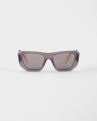 An oversized design and large volumes define these acetate sunglasses. The frame is characterized by the geometric front and sharply beveled outer rims. The three-dimensional workmanship on the temples is decorated with an iconographic interpretation of the traditional Prada triangle logo. - Product code: SPRB18_E20F_FE80Q_C_053 - Recycled bio-acetate frame front - Color: Gray + Gradient Gray to Pink - Frame not compatible with graduated lenses - 100% UVA / UVB protection - Standard Fit - Lens-nose-temple measurement: 54-20-145 mm - Article comes with dedicated packaging - Other colors available - Imported MATERIALS Acetate