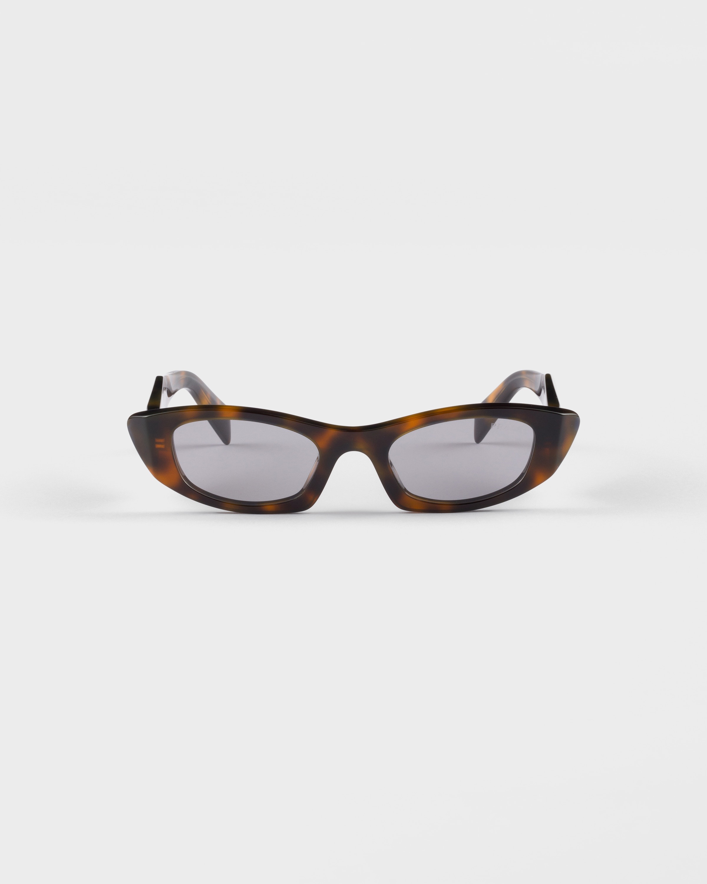 Acetate sunglasses with a bold attitude. The acetate frame features a narrow, geometric front with clean lines and beveled angular outer rims. The three-dimensional workmanship on the temples is decorated with an iconographic interpretation of the traditional Prada triangle logo. - Product code: SPRB16_E20D_FE50Q_C_050 - Acetate frame front - Juniper Tortoiseshell - Frame not compatible with graduated lenses - 100% UVA / UVB protection - Standard fit - Lens-nose-temple measurements: 50-21-145 mm - Article comes with dedicated packaging - Other colors available - Imported MATERIALS Acetate