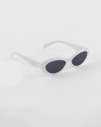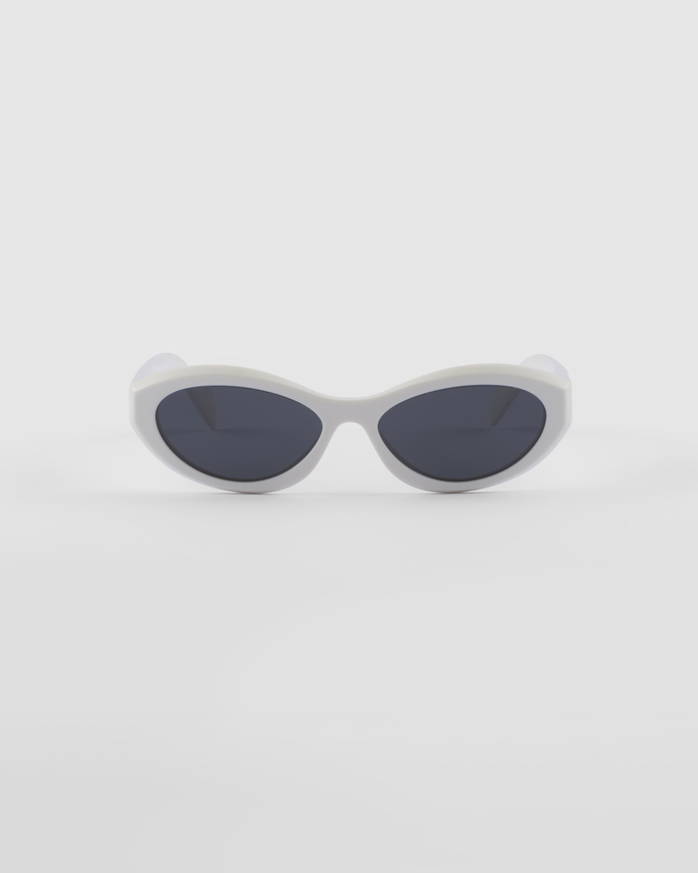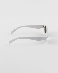Sunglasses with an acetate frame featuring sinuous and slightly beveled rims expressing bold femininity. The thin temples are emphasized by a refined three-dimensional element that iconographically depicts the Prada triangle logo. - Product code: SPR26Z_E17K_FE08Z_C_055 - Recycled bio-acetate frame front - Color: Chalk White - Frame not compatible with graduated lenses - 100% UVA / UVB protection - Standard fit - Lens-nose-temple measurements: 55-16-145 mm - Article comes with dedicated packaging - Other available colors - Imported MATERIALS Acetate