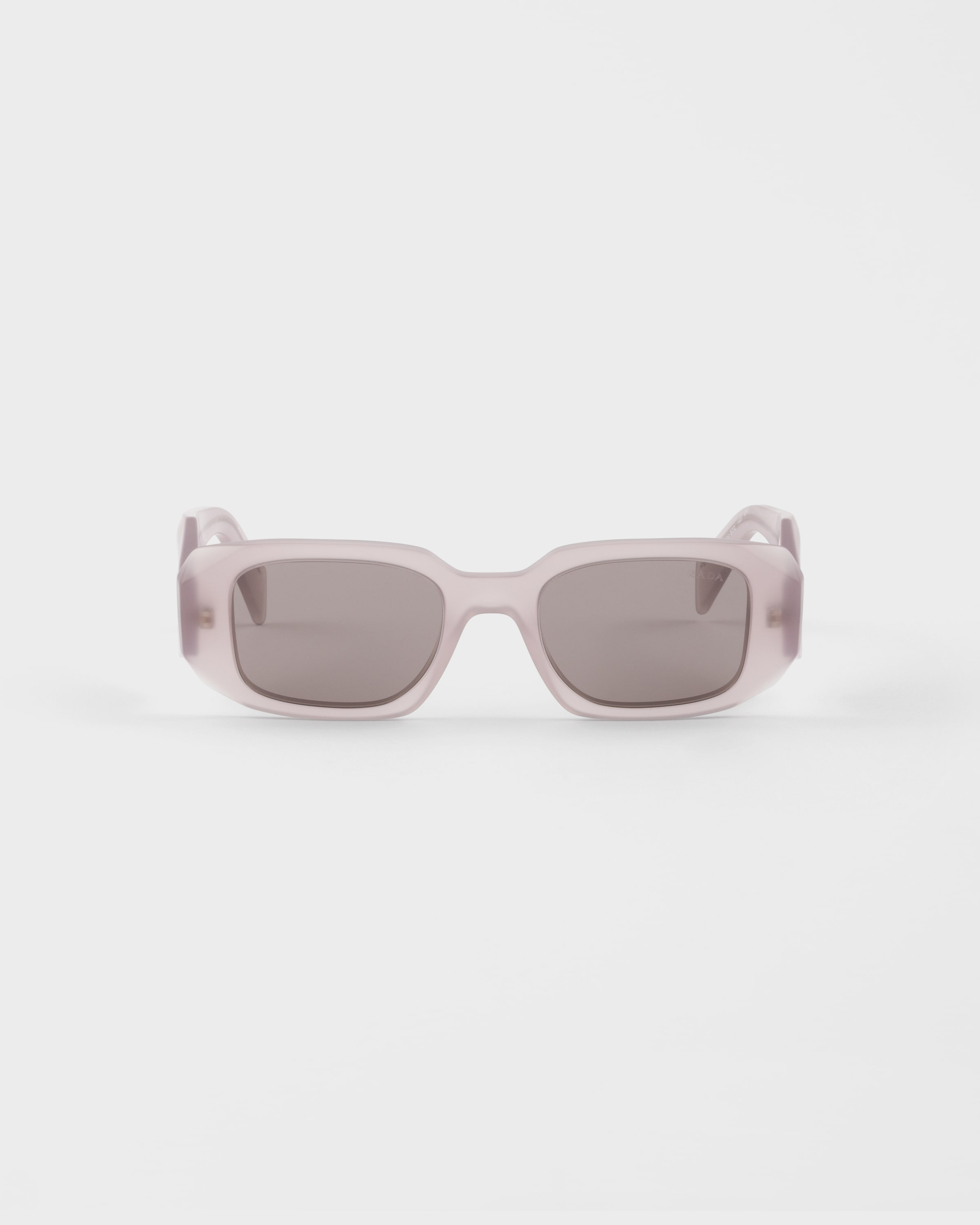 Acetate sunglasses with a geometric design and important volumes. The bold frame highlights the avant-garde rims defined by the sharply beveled external corners. The three-dimensional workmanship on the temples is decorated with an iconographic interpretation of the traditional Prada triangle logo. - Product code: SPR17W_E21H_FE80Q_C_049 - Recycled bio-acetate frame front - Color: Frosted Taupe - Frame not compatible with graduated lenses - 100% UVA / UVB protection - Standard fit - Lens-nose-temple measurements: 49-20-145 mm - Article comes with dedicated packaging - Other colors available - Imported MATERIALS Acetate