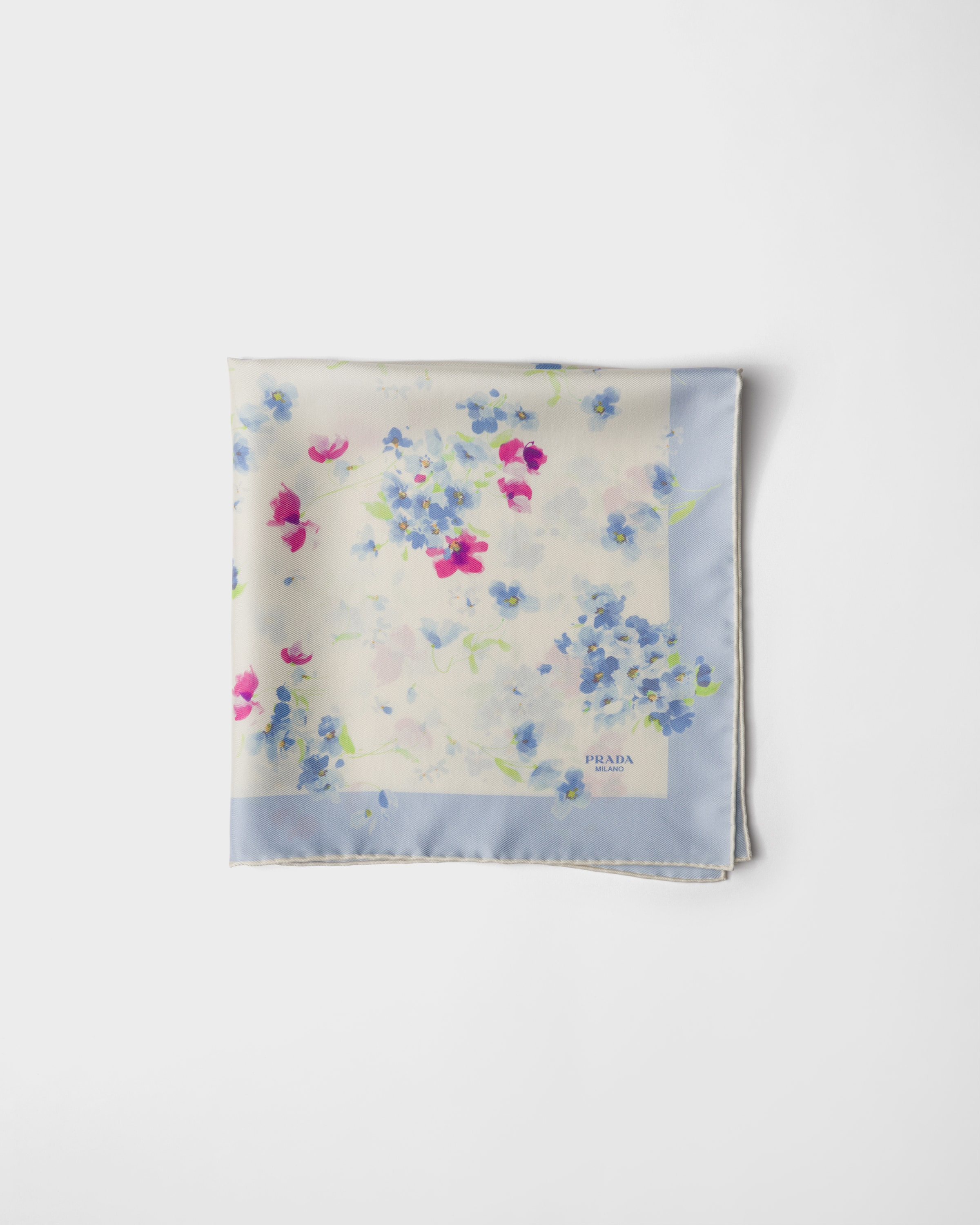 Flowers, rediscovered in their most romantic essence, are the protagonists of this delicate print that embellishes this refined silk twill scarf. - Product code: 1FF004_2HN2_F04RT - Bouquet print - Printed logo - Imported Height: 55cm Width: 55cm MATERIALS Main material: Silk