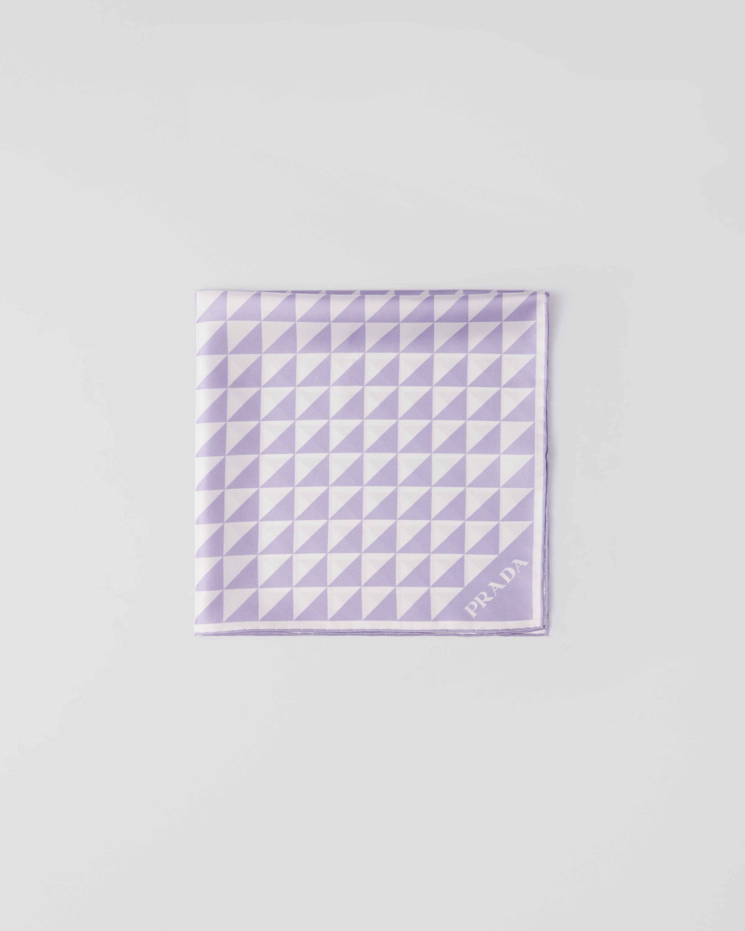 The triangle, Prada's iconic logo since 1913, is reimagined in always new ways and is found in the graphic pattern on this twill scarf. - Product code: 1FF004_2DTP_F0A58 - Triangle print - Print logo - Imported Height: 55cm Width: 55cm MATERIALS Main material: Silk