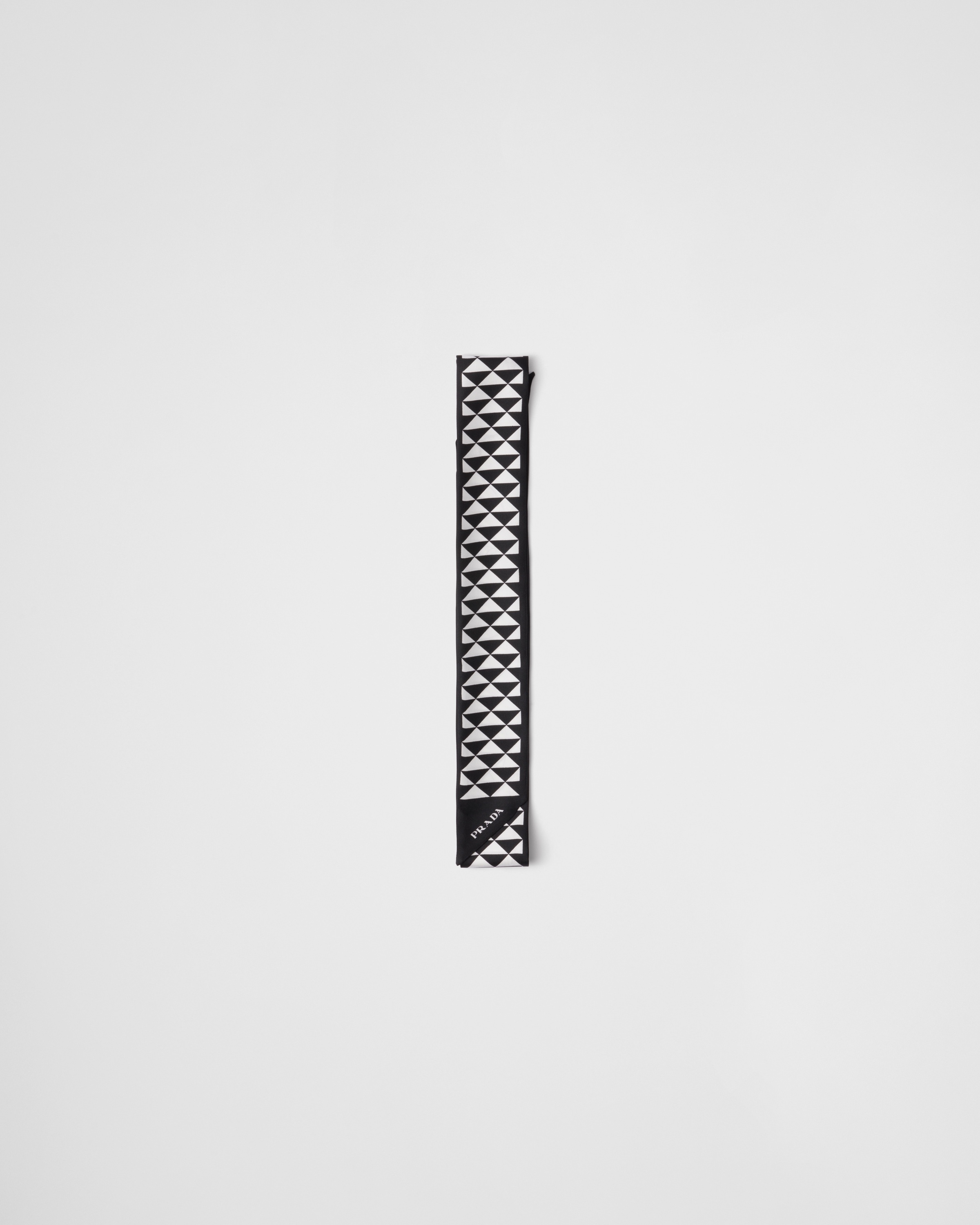 The emblematic Symbole print transforms the sleek lines of the Prada triangle into a modernist geometric pattern that embellishes this skinny scarf made of fine silk twill. - Product code: 1FF025_2DTP_F0967 - Symbole print - Printed logo - Imported Height: 135cm Width: 6cm MATERIALS Main material: Silk